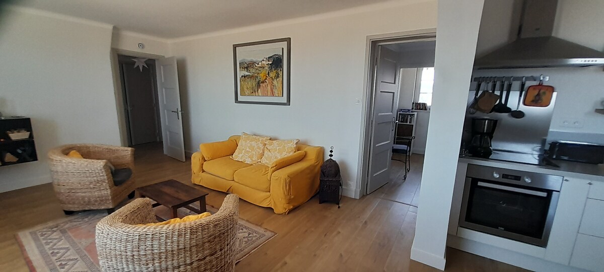 Appartamento moderno e nuovo di 65m2 con posizione eccezionale (vista panoramica sul mare e sui due promontori, accesso diretto sulla diga e sulla spiaggia, 5 minuti a piedi dal centro). Composto da: - ampio soggiorno con cucina a vista su un soggiorno con camino, - ampia camera matrimoniale - camera per bambini più piccola - bagno (doccia, vasca, lavatrice, asciugatrice) e servizi igienici separati - 5 balconi / terrazze - 2 posti auto - Cantina (deposito biciclette; attrezzatura surf)