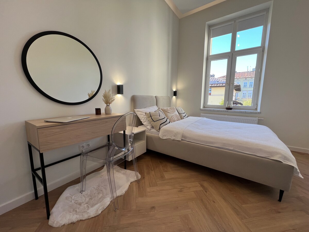 Newly renovated, cozy and stylish 60 m2 apartment on the ground floor of the house, close to the city center, will make you feel like at home. Inside fresh whites, soft grays and clean contemporary lines create a restful ambience. Outdoor you can find a peaceful backyard full of flowers and surrounding green when you can seat and relax. Świeżo wyremontowane, przytulne, 60m2 mieszkanie na parterze budynku mieszkalnego. Do Państwa dyspozycji będzie całe miejsce plus część ogrodowa.