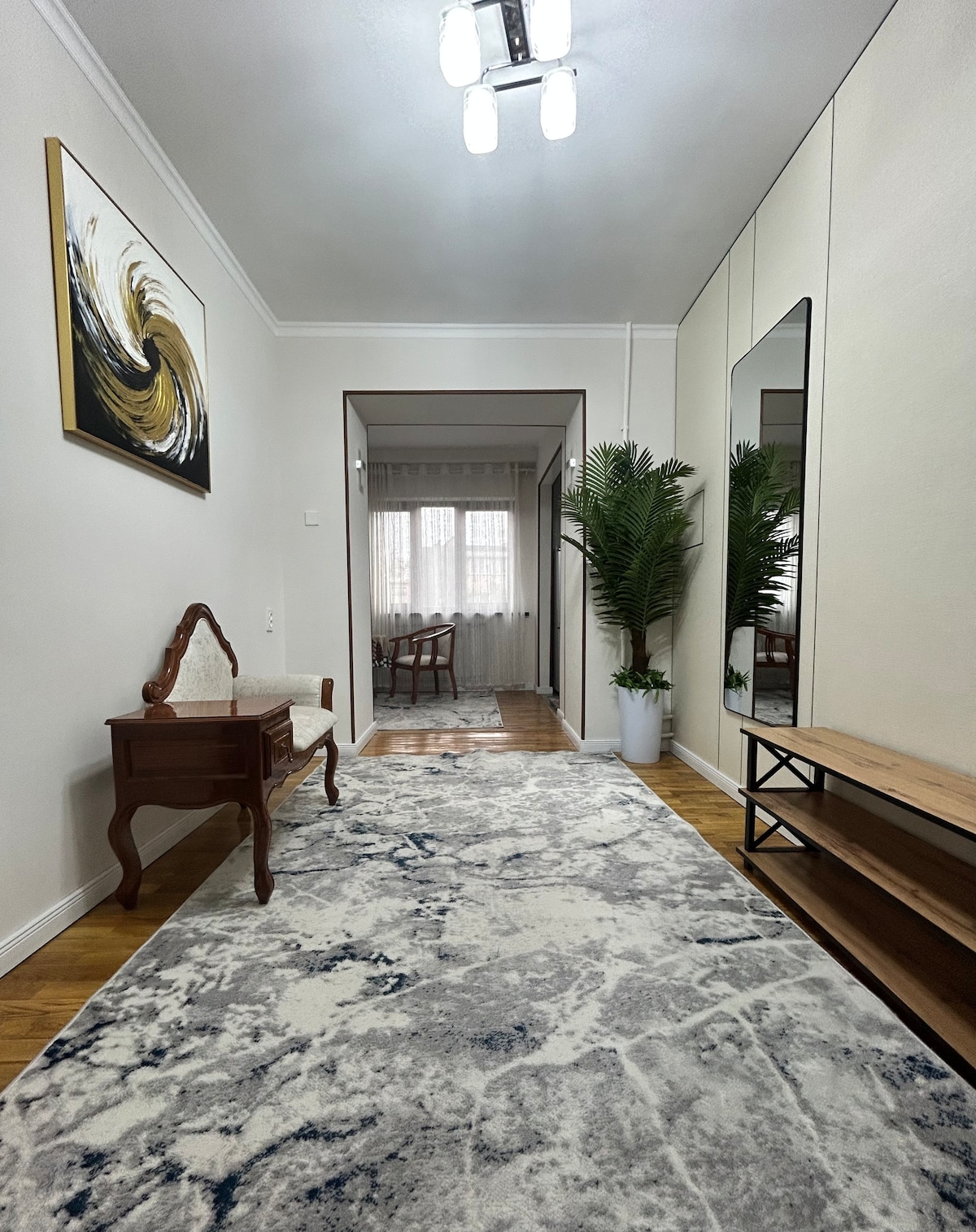 Sunny and spacious apartment in the middle of a green residential area! Your home away from home is in a very quiet neighbourhood, 2 min away from small river and with a lot of green inbetween the houses. There is a park with a refreshing lake to swim, walk or run nearby, the bazar . This bright apartment will make you feel at home from the first second. You’ll love the quiet , the green views, the river, the modern equipment . Welcome to Tashkent, welcome to your home!