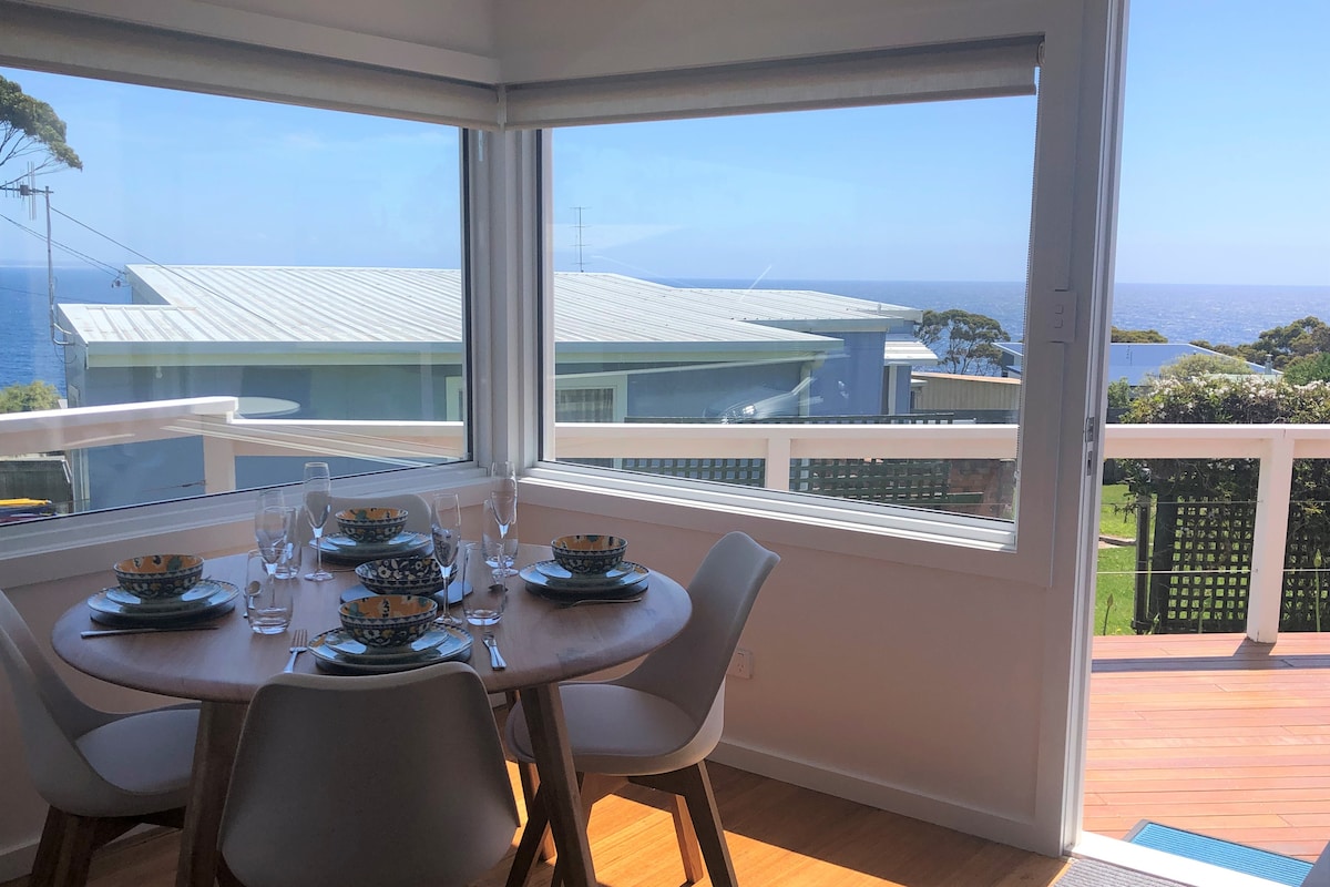 Rilassati sulla terrazza e ascolta il canto degli uccelli in questo spazio unico e rilassante nel sobborgo balneare di Dodges Ferry. Questa casa con giardino è stata costruita con creatività e maestria dal proprietario Paul, in pietra, legno e vetro, e offre una splendida luce e viste sugli alberi e sui tramonti. La casa si trova a 5 minuti a piedi da Park Beach (ottima per il surf) o da Red Ochre Beach (spiaggia tranquilla, ideale per una nuotata o per andare in kayak).