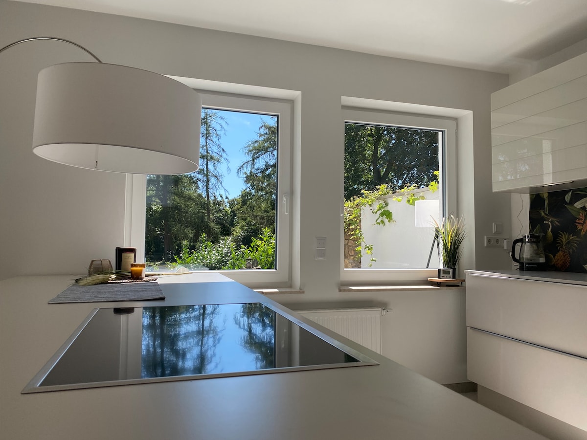 Grazioso appartamento di 80 mq al piano terra, completamente nuovo costruito nel 2018, con sauna, cortile, caminetto, bagno con vasca e grande doccia e cucina completamente attrezzata. Molto centrale, a 2 minuti dalla metropolitana, a 5 minuti da tutti i ristoranti/ centri commerciali e dalla graziosa città storica di Oberursel, a 10 min. lungo l'Urselbach (piccolo torrente) fino alla piscina . Francoforte/M. 10 min. in auto o 20 min. in metro. Oberursel si trova direttamente sul Großer Feldberg, con molte possibilità di escursioni.