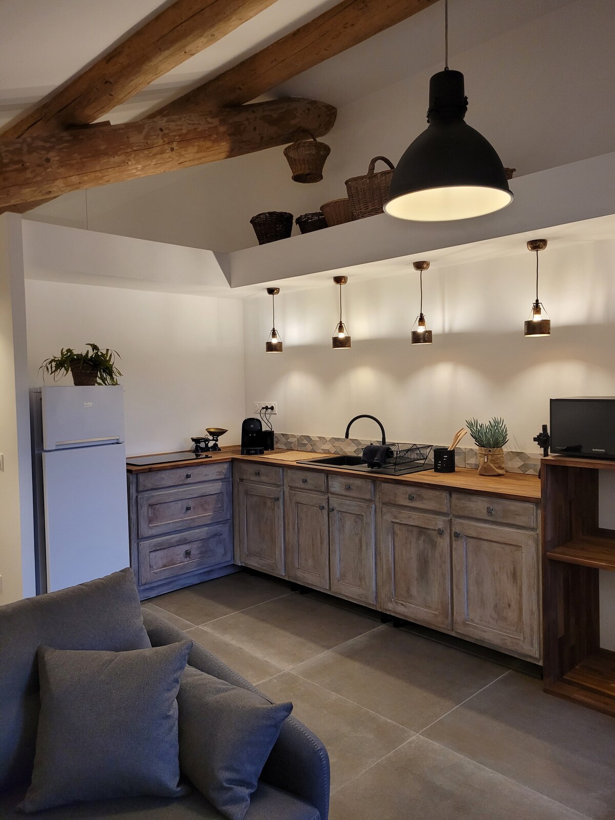 Benvenuti a Le Coquelicot, un tranquillo rifugio provenzale incastonato tra le antiche mura di Le Clos des Chartreux a Villeneuve-lès-Avignon, a pochi minuti da Avignone. Questo romantico e spazioso loft monolocale è pieno di anima e carattere. Con pareti in pietra a vista, mobili antichi, travi in legno e un'incantevole camera da letto a soppalco, Le Coquelicot unisce eleganza rustica e comfort moderno. Con due bagni completi (uno su ogni livello) e un divano letto molto comodo, questo è il posto perfetto per le famiglie.