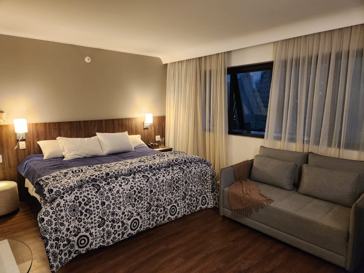 Appartamento di lusso, 26 m² di atmosfera accogliente e Wi-Fi. 11° piano. A 5 minuti a piedi da PAULISTA AVENUE e dalla metropolitana. Reception 24 ore su 24, 7 giorni su 7 Superhost + 170 recensioni [MOTIVI PER PRENOTARE QUESTO APPARTAMENTO] - Struttura completa intorno all'appartamento: ristoranti, mercati, centro commerciale, parco, metropolitana, ospedali e farmacie - Appartamento inserito nell'ambiente sicuro di un hotel a 4 stelle e che contiene un'infrastruttura completa con 2 ristoranti, centro fitness, piscina e sauna - Dispensa, 2 letti o 1 letto king size, aria condizionata