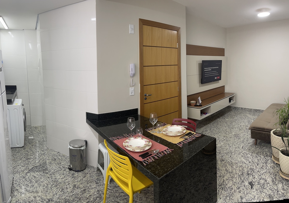Moderno appartamento, 32m2, situato nel miglior punto di Sion. Cucina pratica con frigobar, piano cottura, TV (canali aperti/Netflix), aria condizionata, asciugacapelli, bollitore elettrico e internet. Zona Sud, vicino a Praça JK e Avenida Bandeirantes, di fronte a un supermercato. Rooftop dell'edificio con palestra, sauna, piscina, area comune e cucina in comune (acqua, macchina per il ghiaccio). Pulizie su richiesta disponibili. Edificio sicuro con portineria 24 ore su 24. *Non è incluso il parcheggio.
