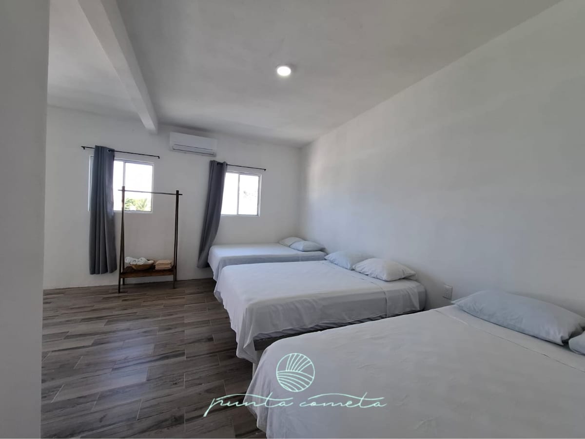 Cada habitación es para 4 personas, contamos con una pequeña área de acampar en la propiedad, las personas que quieran acampar tendrán acceso regaderas y WC exclusivo para esa área, estamos en la calle principal de la entrada a la playa de Costa Esmeralda solo que del lado de la base de taxis, realmente muy cerca de la playa solo hay que cruzar la carretera, WiFi, Cable, ventilador de techo, agua caliente, estacionamiento, el área es demasiado segura y muy tranquila.