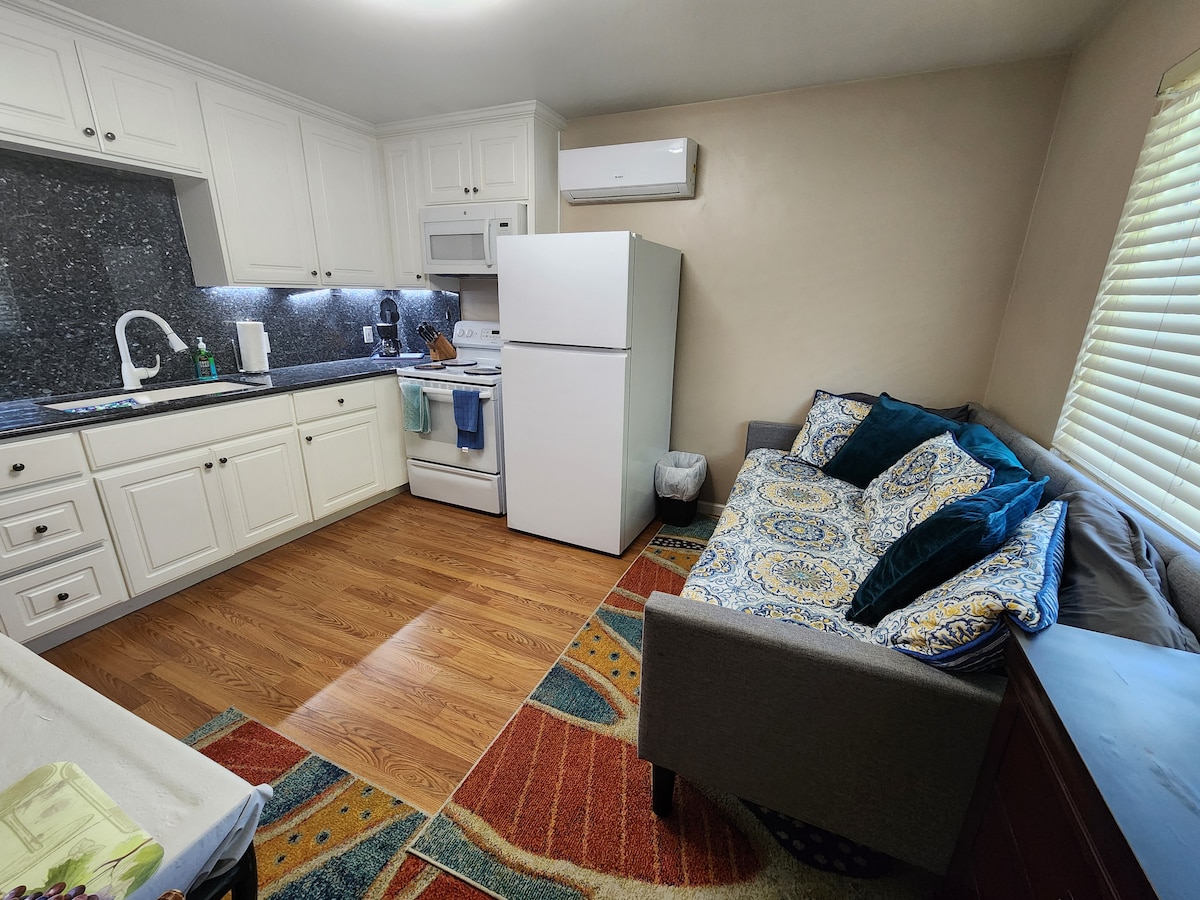 Scopri il comfort nel nostro accogliente monolocale immerso nel cuore di Bakersfield, in California. A pochi passi dalle delizie culturali e culinarie della città, la nostra casa completamente attrezzata promette un soggiorno senza problemi con tutti gli elementi essenziali a portata di mano, caffè fresco, frullatore, tostapane, forno a microonde, ecc. Che tu sia qui per lavoro o per vacanza, il nostro accogliente rifugio offre la combinazione perfetta di comodità e relax. 1 bambino è permesso ai neonati o ai bambini! Adatto agli animali domestici Cucina completamente attrezzata WiFi gratuito
