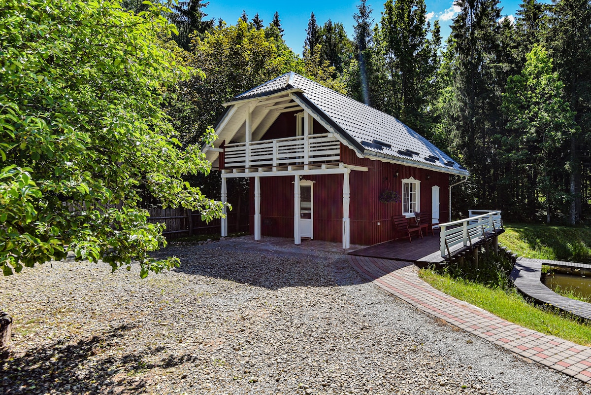 Rilassati con tutta la famiglia in questo alloggio tranquillo. Alloggio unico per pescare, nuotare e rilassarsi. il nostro log, rustico lodge è perfetto per gli amanti della natura che apprezzano la pace e l'armonia. Primo piano - sauna, mini cucina, salotto. Terrazza esterna con pareti glace per cenare con vista lago. Zona barbecue con Komado. Secondo piano - una camera da letto 1 matrimoniale, 2 letti singoli, seconda camera letto matrimoniale. Oltre a una terrazza sul tetto con mobili da esterno e vista mozzafiato. Buon divertimento!