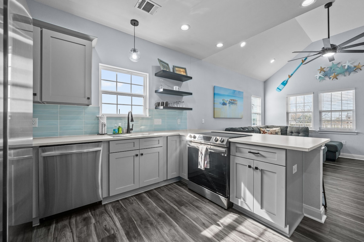 COASTAL OASIS A perfect combination of luxury and comfort! A little hidden gem, a beautifully decorated, spacious new home. While enjoying your stay, take a short stroll down the street to go fishing, relax on the porch, soak in the water view, and enjoy the spectacular sunsets. Home includes: Open-concept floor plan for you to entertain or relax, gourmet modern kitchen, private patios off each retreat. 10 mins. to Kemah Boardwalk, 25 mins. to Galveston & many top rated restaurants close by