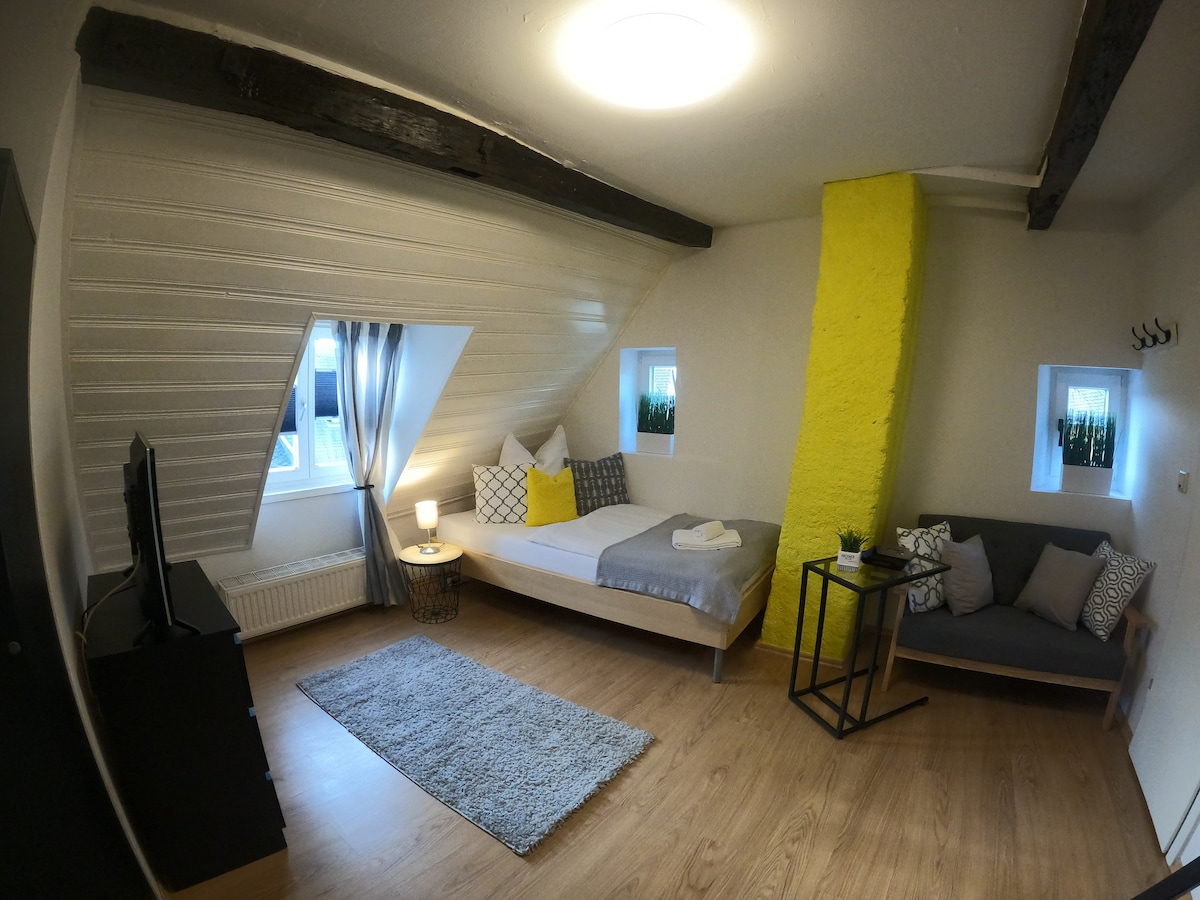 Accogliente appartamento con una camera da letto, cucina e bagno. Nel soggiorno - camera da letto c'è una scrivania spaziosa, un letto singolo, un altro letto supplementare può essere prenotato per 5,-€ a notte. TV e poltrona sono inoltre disponibili. La cucina è attrezzata con frigorifero, forno a microonde, macchina per il caffè, bollitore e 2 fornelli. Tazze, stoviglie, ecc. sono disponibili in quantità sufficiente, così come un piccolo tavolo da pranzo e due sedie. Nel bagno con finestra ci sono un wc, un lavandino e una vasca. C'è un parcheggio gratuito di fronte all'appartamento. La consegna delle chiavi avviene presso l'appartamento. A piedi la WHU è raggiungibile in meno di 10 minuti e il centro della città in cinque minuti. La casa si trova a circa 50 metri dal Rheinsteig e da Schönstadt.