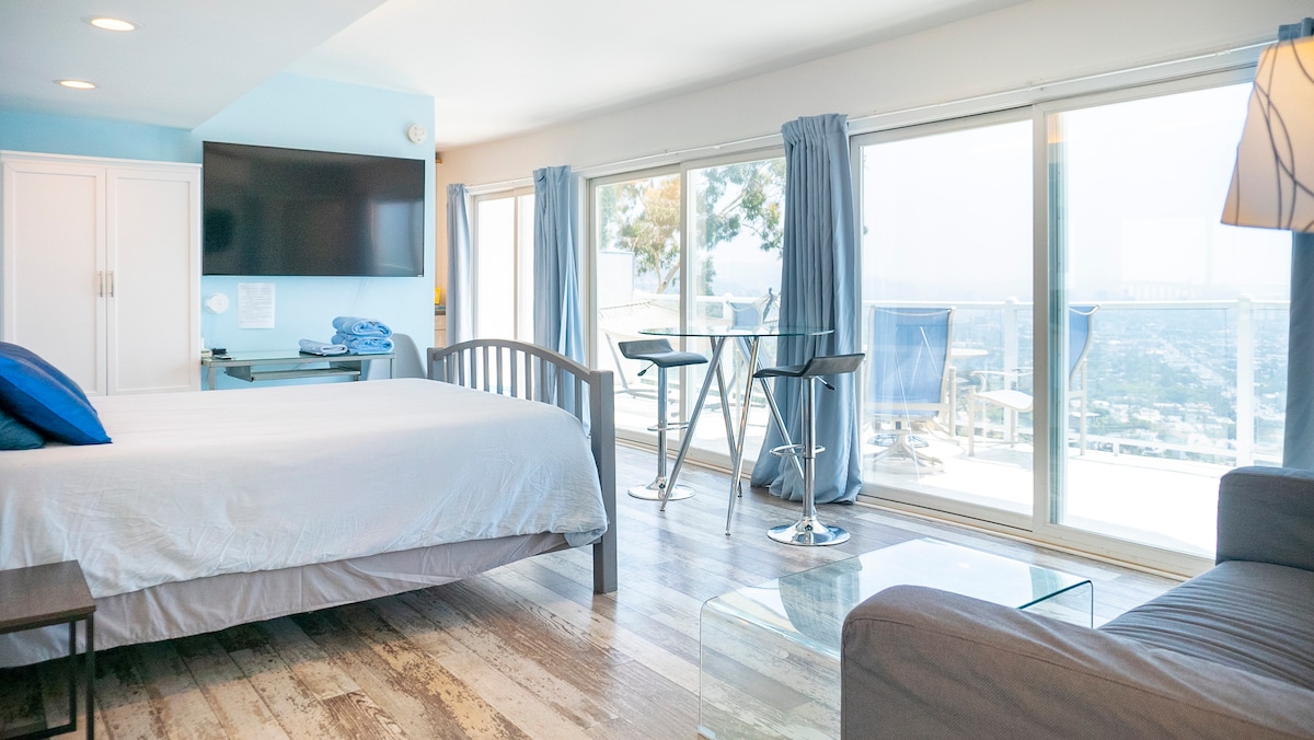 Spectacular Hollywood Hills studio perched 870 feet above sea level with unobstructed views of the Chateau Marmont, downtown LA, Long Beach, and the Pacific Ocean stretching to Catalina Island. The view is genuinely breathtaking - photos don't do it justice. Minutes from Sunset Strip and West Hollywood.