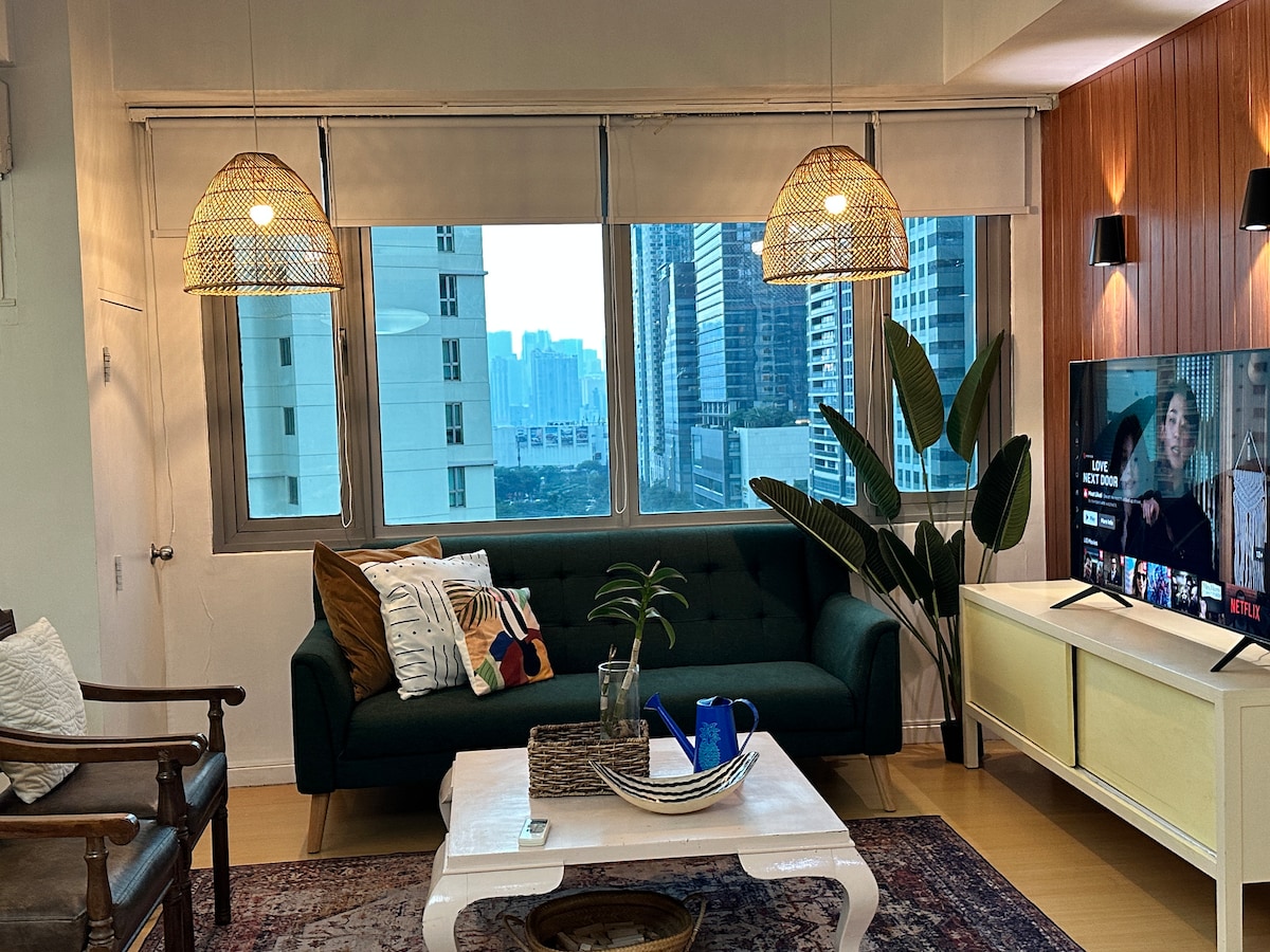 1 camera da letto a tema boho con balcone in Uptown BGC | TV da 65 pollici