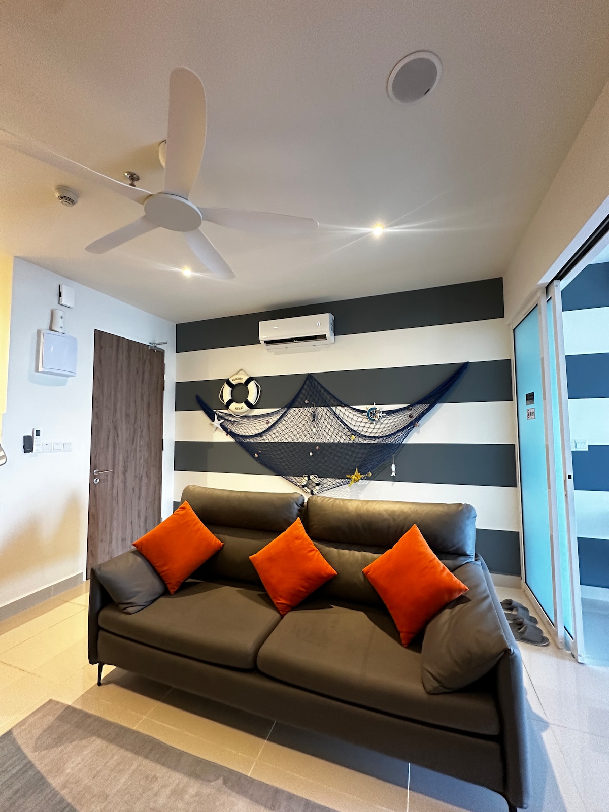 Splendida vista sul mare da casa. Rilassati sul balcone. Piscina@livello 6 Soggiorno, camera da letto con letto queen-size, divano letto privato con tende. Bagno privato con doccia con acqua calda e fredda. Sono disponibili un grande frigorifero con ghiaccio, una mini cucina con fornello elettrico, pentola, piatto, cucchiaio e forchetta. Cucina leggera in cucina. Macchina per filtrare l'acqua calda e tiepida. Seleziona 3 ospiti se hai bisogno di un letto singolo convertito da divano letto.