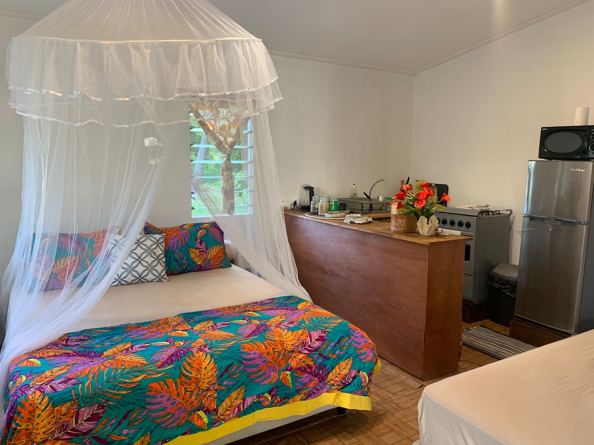 Profitez en famille de ce fabuleux logement qui offre de bons moments en perspective. A mi chemin entre l'océan et le lagon et à deux pas de l unique ferme perliere de l'île , d'une supérette et pizzeria. Notre bungalow climatisé peut accueillir 2 adultes et 2 enfants. Équipé d'un grand lit King size, un canapé lit et d'une kitchenette tout équipés . Internet et vélos seront mis à disposition gratuitement. Nous vous proposons un service de navette gratuit pour vos arrivées et départs .