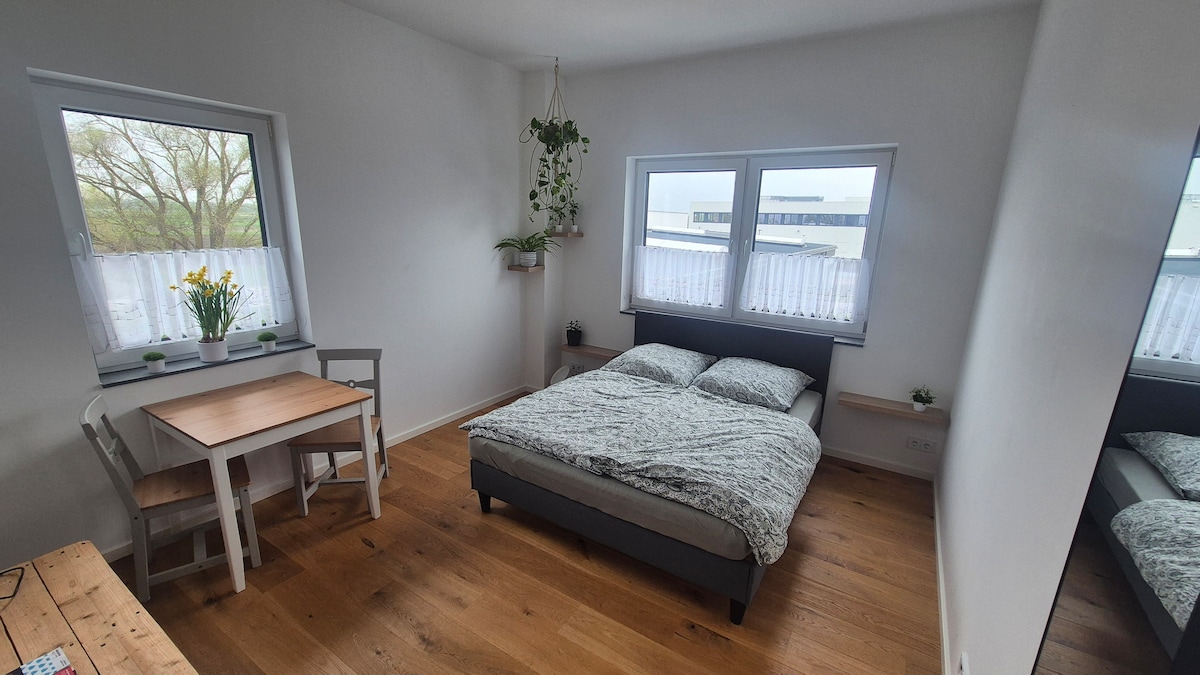 Posto letto semplice e accogliente nella nuova camera da letto e bagno. Attualmente ancora senza cucina La fermata dell'autobus si trova a circa 100 metri di distanza. E anche il nuovo parco per surf è a pochi minuti a piedi. L'appartamento è situato in una zona commerciale. I miei vicini sono aziende artigiane. Pertanto, a partire dalle 7:00 può occasionalmente essere rumoroso.