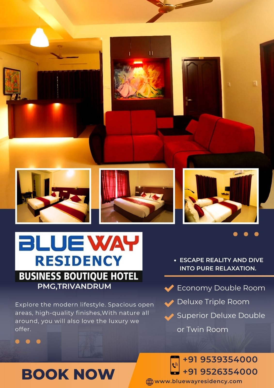 We are the premium Hotel property under the brand name, Blueway Residency Business Boutique Hotel. Our hotel located near Govt Law College, PMG, Trivandrum, Kerala provides easy access to all major parts of our capital city including Secretariat international and domestic airports, train and bus stations,etc. Our property is in close vicinity to some of the main attractions namely Napier Museum, Zoo, Kanakakunnu Palace,Priyadarshini planetarium,etc