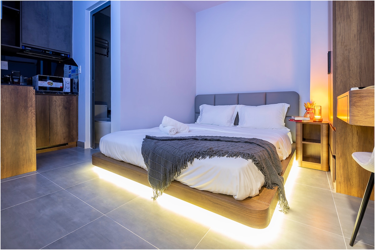 Monolocale dal design accattivante, posizione comoda e ascensore diretto. Situato proprio nel centro della città di Thu Dau Mot, a 5 minuti di auto o a 10 minuti a piedi dalle torri più commerciali della città (Becamex Binh Duong), vicino a una serie di opzioni per mangiare, bere e rilassarsi, ma comunque tranquillo per un soggiorno confortevole. ✯ Check-in e check-out di persona Assistenza online e offline✯ 24 ore su 24 ✯ Abbiamo più unità in casa, quindi non esitare a chiedere se hai bisogno di più posti letto