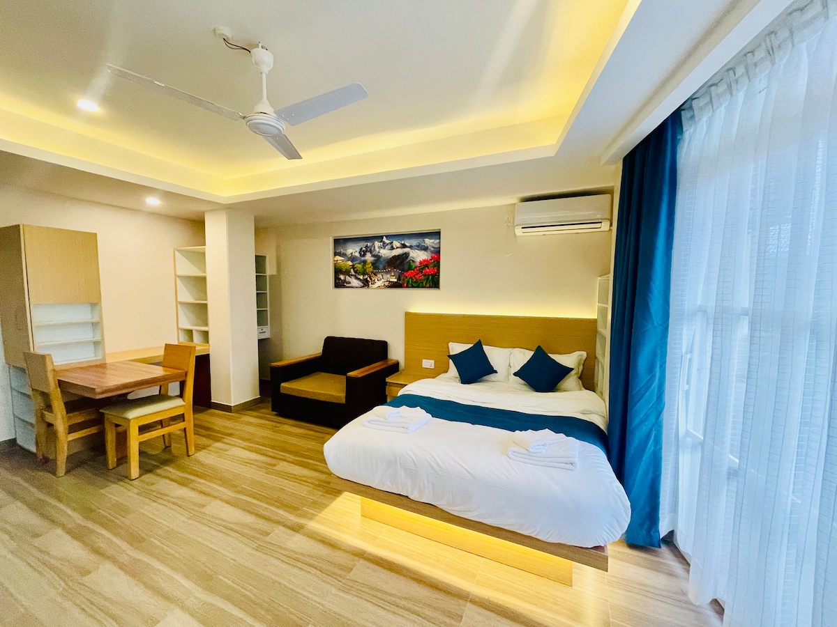 Questo elegante monolocale, progettato con cura, è perfetto per chi viaggia da solo, per le coppie o per chi lavora in remoto. Situato nel cuore di Pokhara, sarai a pochi passi da caffè, negozi e luoghi. Lo spazio dispone di un comodo letto matrimoniale e un letto singolo, un angolo cottura completamente attrezzato, Wi-Fi ad alta velocità e una smart TV per il tuo tempo libero. Le ampie finestre lasciano entrare la luce naturale e l'arredamento unisce il comfort moderno a un tocco di fascino. Non esitare a chiedere informazioni su servizi come la lavanderia o luoghi vicini da esplorare!
