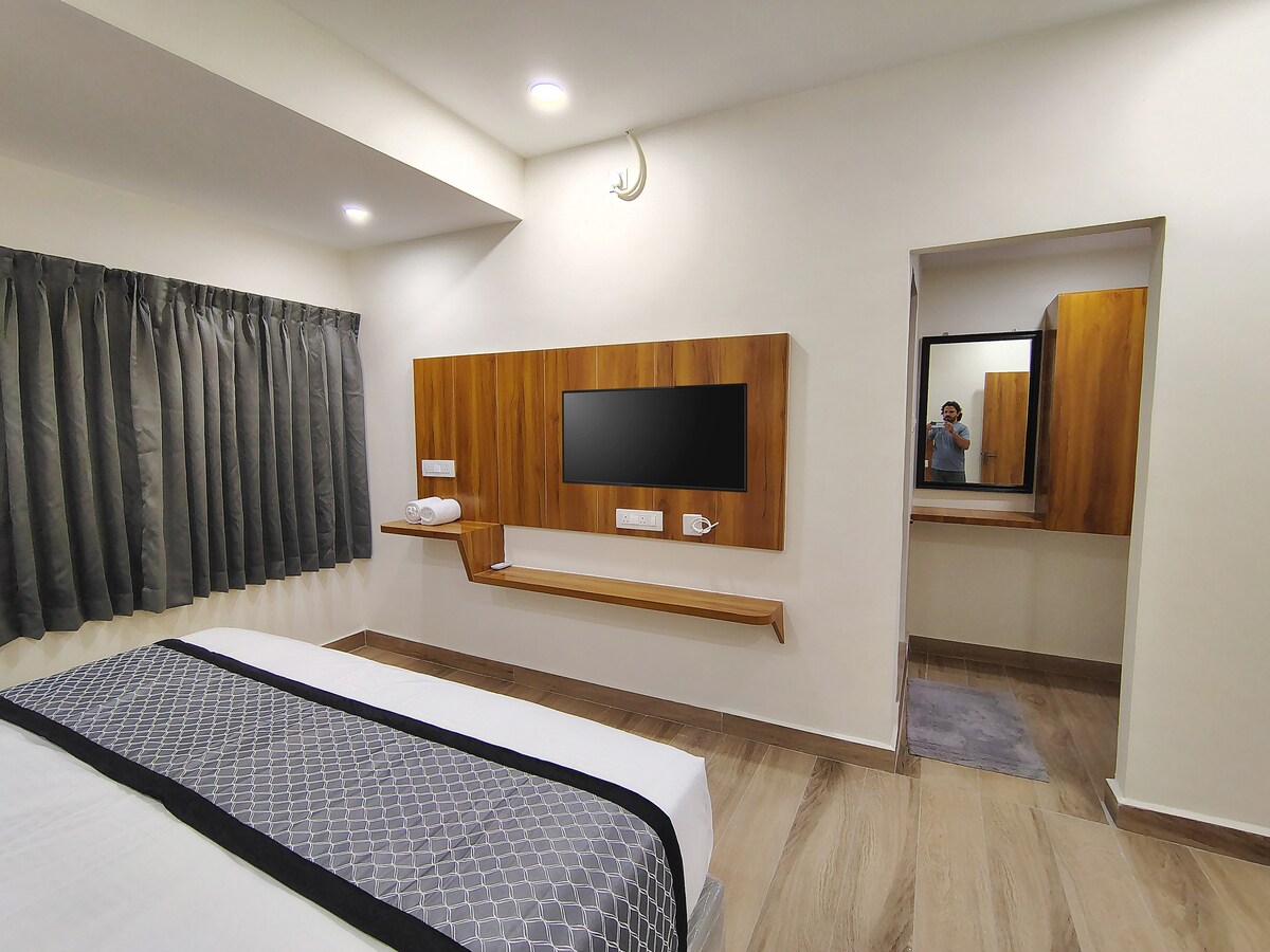 A premium 3-star hotel nestled in a peaceful temple town, thoughtfully designed to offer comfort, elegance, and tranquility. The hotel features tastefully furnished rooms with modern amenities including high-speed Wi-Fi, air conditioning, smart TV, and well-appointed bathrooms. With a pure vegetarian dining option, ample parking and 24-hour front desk, the hotel is ideal for pilgrims seeking a refined stay without compromising on serenity and value.