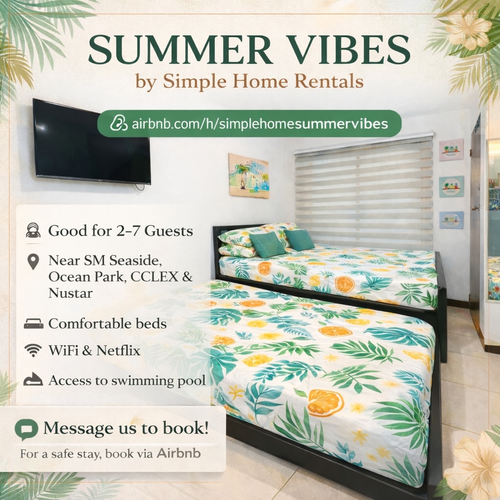 The pool is under repair. Welcome to our cozy loft, Located on the 11th floor with stunning city views. Just minutes away from cebu malls • Features: • Queen-size bed • Convertible couch • 55-inch TV • Air conditioning • High-speed WiFi • Kitchen with essential appliances • Extra Folding bed (available upon request) Building amenities: • Gym • Pool • Paid parking and free parking(until 10pm) Conveniently located near: • Groceries • Cafes • Spa