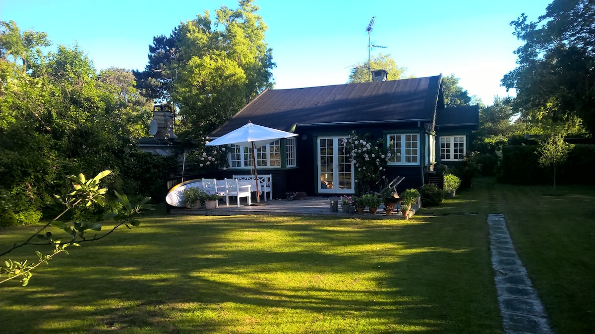 Piccolo cottage in legno situato in un grande giardino lussureggiante, privato e separato dalla casa principale, a pochi minuti da una grande foresta, da incantevoli spiagge e da un'affascinante città con negozi, caffè e ristoranti, e vicino alla ferrovia. Dispone di una camera principale con due letti uniti, una cucina separata per cucinare semplicemente e un bagno. La terrazza ha un tetto ed è circondata da fiori, alberi e cespugli. Adatto per una fuga romantica.