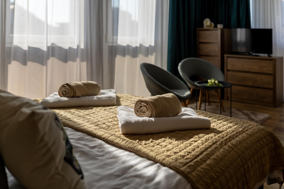 A pochi passi dalla spa e a 10 minuti a piedi dal centro della città, puoi vivere nel cuore della città. L'appartamento dispone di una piccola cucina, bagno e una camera con letto matrimoniale (140x200 cm). Si trova al 10° piano (l'ascensore sale solo fino all'8° piano).