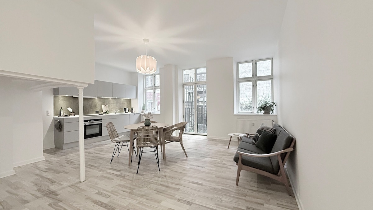 Wake up to soft light on pale wooden floors and enjoy your coffee in the bright, open kitchen. The space feels warm and personal, with art, photos, and cozy touches. Step onto the balcony for a view of the leafy square. Located between Fælledparken and Svanemøllen Beach, with shops, cafés, and public transport nearby. The metro is just a minute away, and the city center is 10 minutes by bike. Street parking is available via EasyPark, with free options nearby.