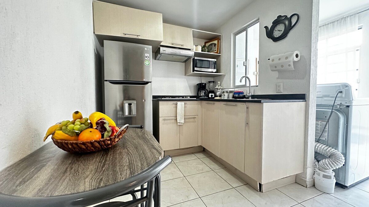 Benvenuti nel nostro moderno e accogliente appartamento nel cuore di Tlaquepaque Questo spazio ha due camere, la principale con aria condizionata e letto matrimoniale, e quella secondaria con due letti singoli, lavanderia con lavatrice e asciugatrice, bagno privato e cucina completamente attrezzata. L'arredamento è elegante e accogliente, con tocchi di design in tutte le aree. Sentiti a casa mentre ti godi tutti i comfort moderni, WiFi ad alta velocità. Smartv.