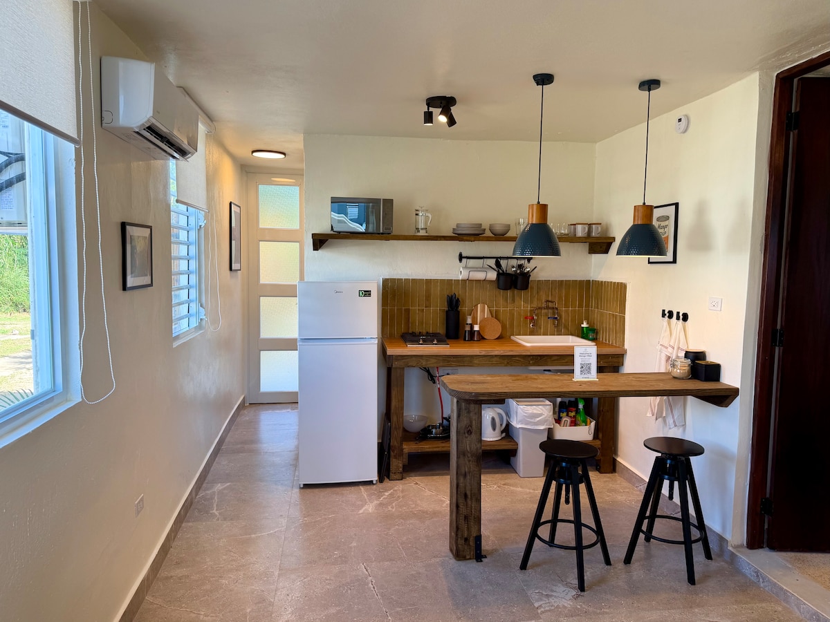 Goditi il massimo relax e il fascino dell'isola in questo monolocale arredato con gusto! Goditi un comodo letto matrimoniale, un bagno completo e una cucina completa, attrezzata per tutte le tue esigenze culinarie. Sali sulla terrazza per goderti la tranquilla vista sul giardino, perfetta per un caffè mattutino o per rilassarti la sera. Un materasso gonfiabile è disponibile per ospitare un terzo ospite a soli 20 $ al giorno. Il tuo rifugio perfetto a Porto Rico ti aspetta!