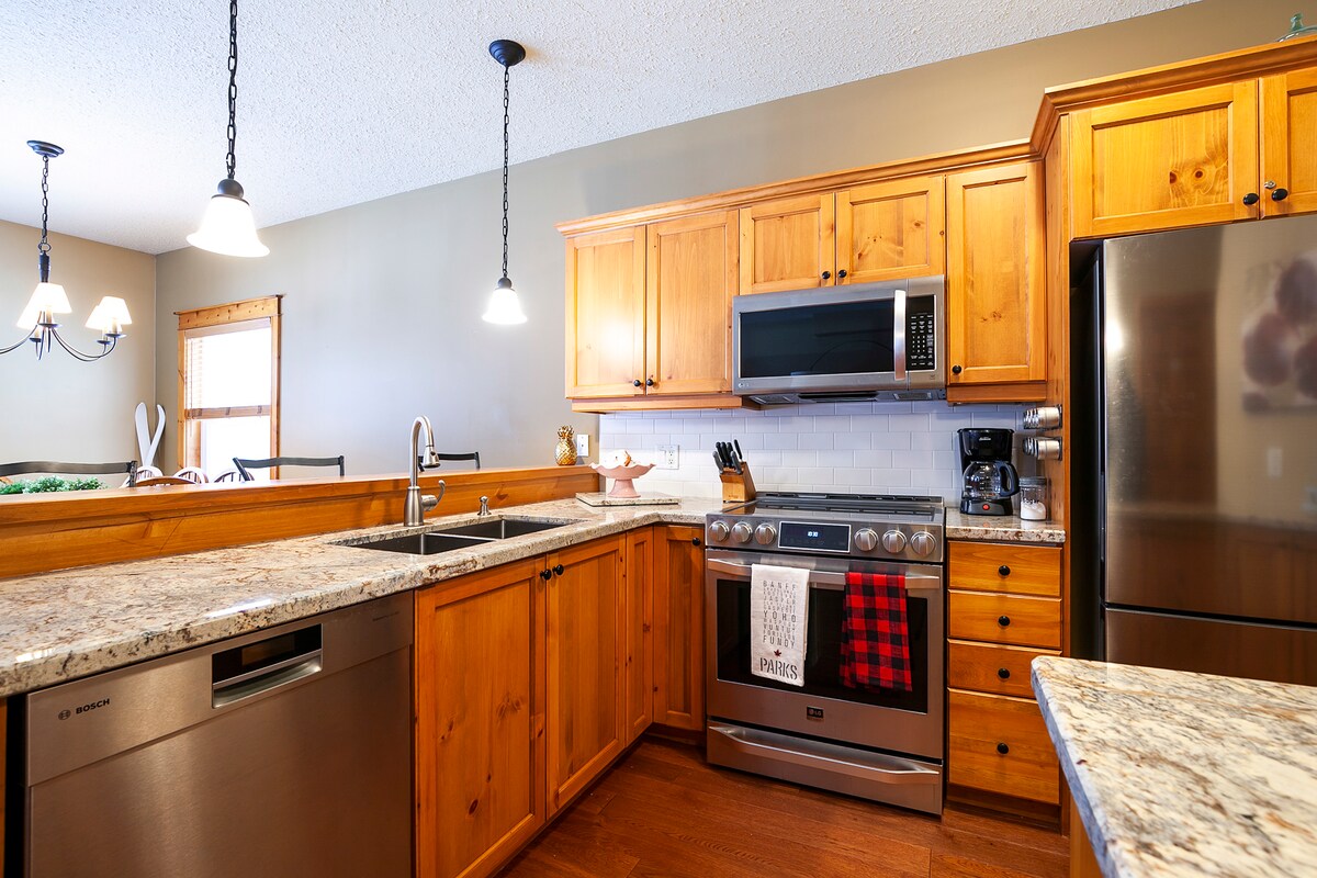 ACCESSO DIRETTO ALLE PISTE DA SCI dal terrazzo posteriore (a seconda della neve)!! Nota la quantità di comodi posti a sedere per NOVE PERSONE intorno alla TV, di cui molti altri alloggi sono privi. Alla fine di una lunga giornata sugli sci, avere un posto comodo dove tutti possono sedersi è ciò che manca nella maggior parte degli chalet. Goditi il bellissimo chalet al PIANO TERRA ristrutturato della nostra famiglia, con 2 camere da letto, 2 bagni e 6 letti, situato in posizione strategica accanto al Blue Mountain Inn. Blue Mountain Village dista 7 minuti a piedi. Posizione, posizione, posizione