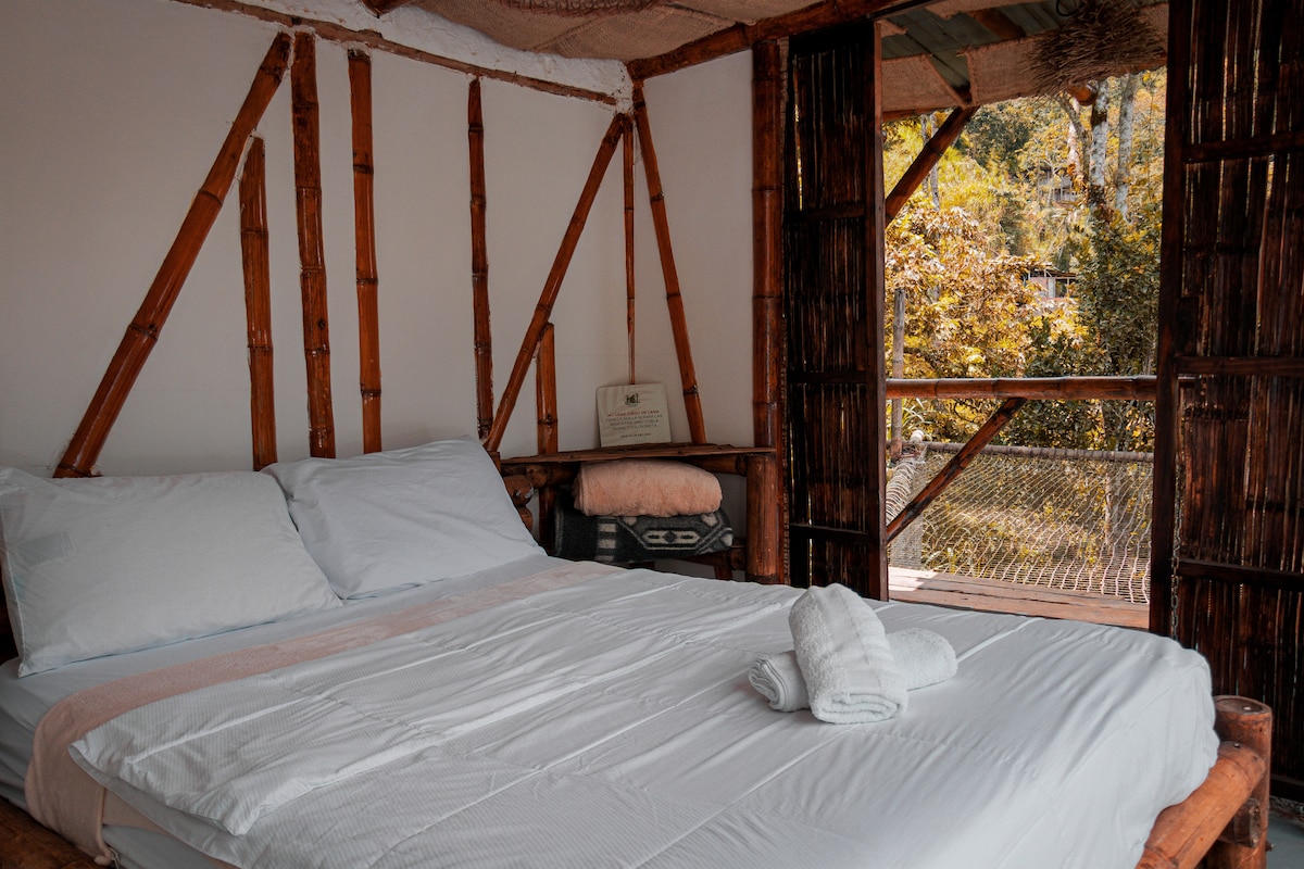 Glamping en medio de los bosques de Boquía en Salento Quindío. Ambiente de flora y fauna silvestre. Un glamping en construcción rustica con materiales de la región como la guadua y maderas y en combinación con acabados modernos. Frutas, café, cereales y yogurt gratis durante la estadía. Cerca a ríos, cascadas y rutas para avistamiento de aves. Dotación completa de cocina y equipo para avistamientos de flora y fauna. wifi, agua caliente, parqueadero. Ambiente totalmente privado e independiente.