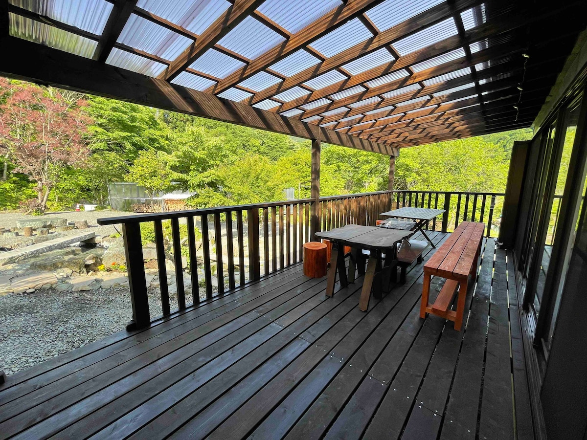 雨でもBBQが出来るウッドデッキ、薪ストーブ、広い庭のある道志村貸切別荘