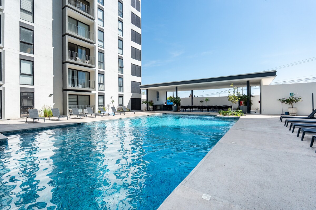 Vieni a rilassarti in questo appartamento straordinario ed esclusivo. Abbiamo tutto il necessario per un soggiorno fantastico. Appartamento con 1 camera da letto con letto queen-size, 1 TV, 1 bagno, wifi, 2 mini split e 1 posto auto. Nelle aree comuni abbiamo accesso a una spaziosa piscina, area di coworking, tavoli da biliardo per il tuo divertimento. Oltre alla possibilità di giocare a padel.