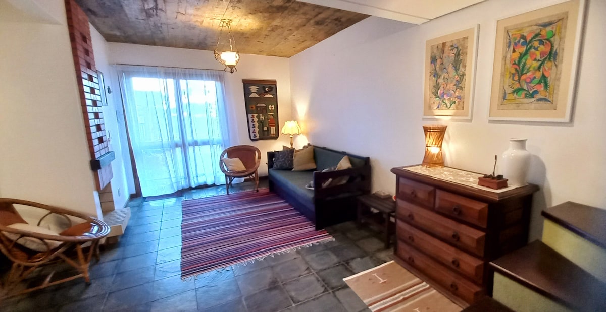 1 camera da letto con aria condizionata, ampio garage coperto e chiuso, lavatrice, barbecue, camino, wi-fi e postazione di lavoro. Può ospitare fino a 4 persone, situato in Rua Araranguá, all'angolo con Beira Mar, di fronte alla spiaggia, a 450 metri dal fiume Mampituba che confina con Torres. Nella camera da letto un letto matrimoniale, nel soggiorno un letto a soffitto e un divano letto che può essere trasformato in due letti singoli o in un altro letto matrimoniale. Offriamo biancheria da letto a noleggio, oppure puoi portare la tua.
