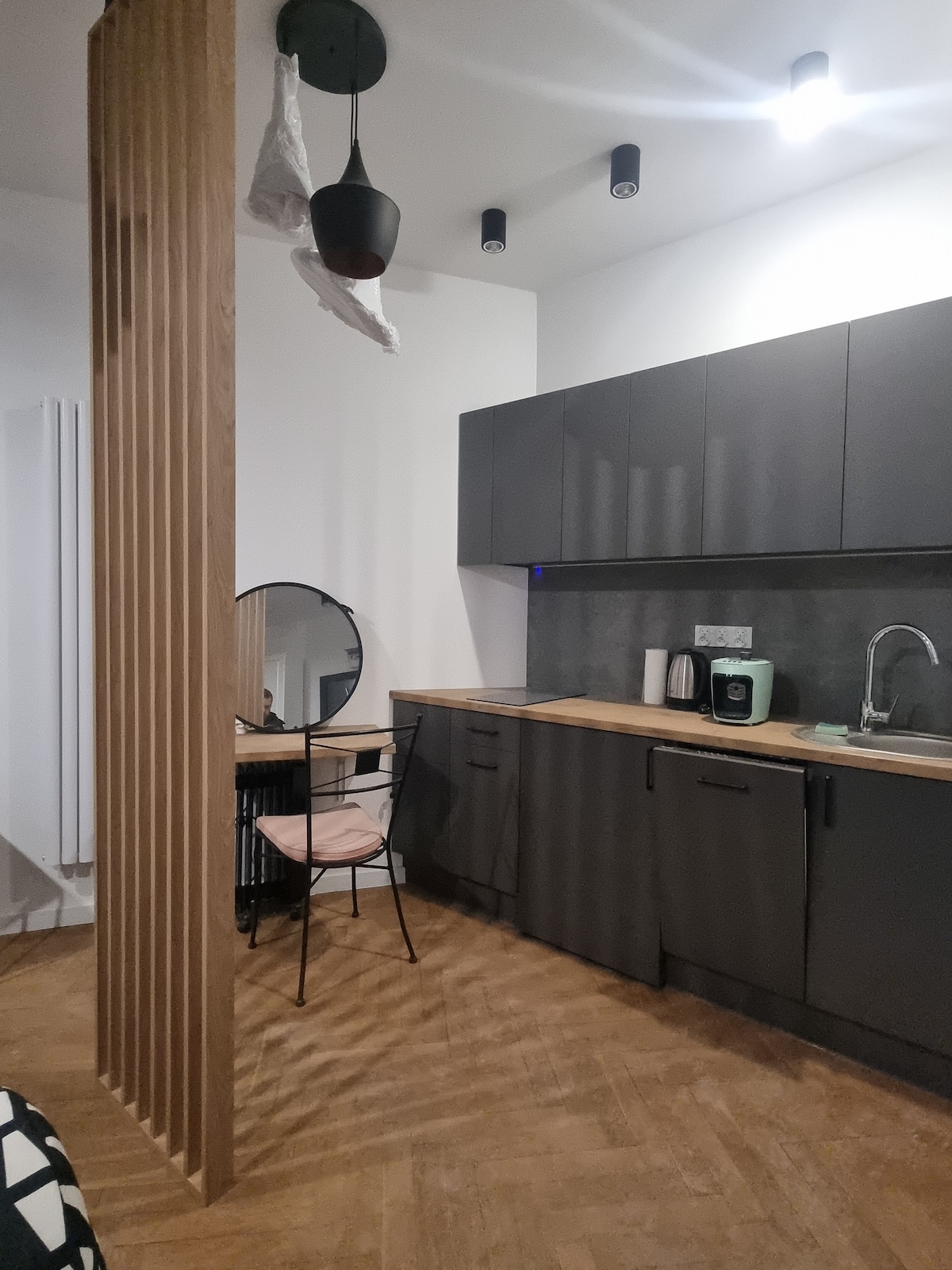 Un appartamento in stile industriale, ben curato nei toni del bianco, del grigio e del nero. Sentiti a tuo agio in un interno crudo e minimalista, scopri il lusso in tutto il suo meglio. Millennium Park L'appartamento è situato vicino allo storico Millennium Park. Grazie alla sua ottima posizione, ci vorranno circa 20 minuti a piedi per il centro storico. C'è una fermata di trasporto pubblico accanto all'appartamento. Per le persone che amano esplorare attivamente la città, offriamo due biciclette.