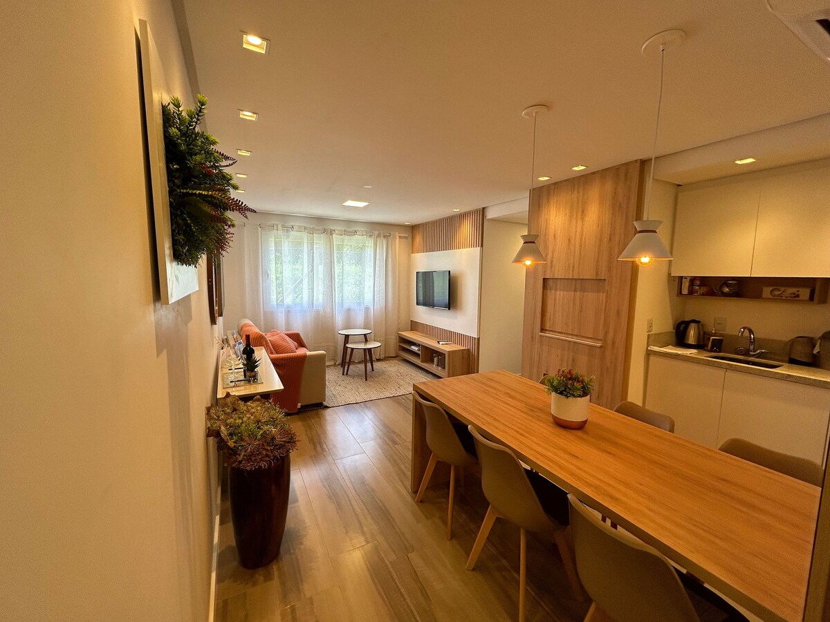 La tua scelta migliore nella Serra gaúcha! Questo appartamento nuovo e completamente arredato può ospitare fino a 8 persone (2 camere da letto + materasso aggiuntivo e divano letto), con tutti i comfort necessari. Situato in un quartiere tranquillo di Três Coroas, vicino ai mercati e a pochi km da Gramado, Canela e São Chico, sarete circondati dalle destinazioni più amate della regione. Goditi anche il turismo avventuroso con il rafting, il tempio buddista e le bellezze degli interni di Igrejajinha. Perfetto per rilassarsi ed esplorare le bellezze della catena montuosa!