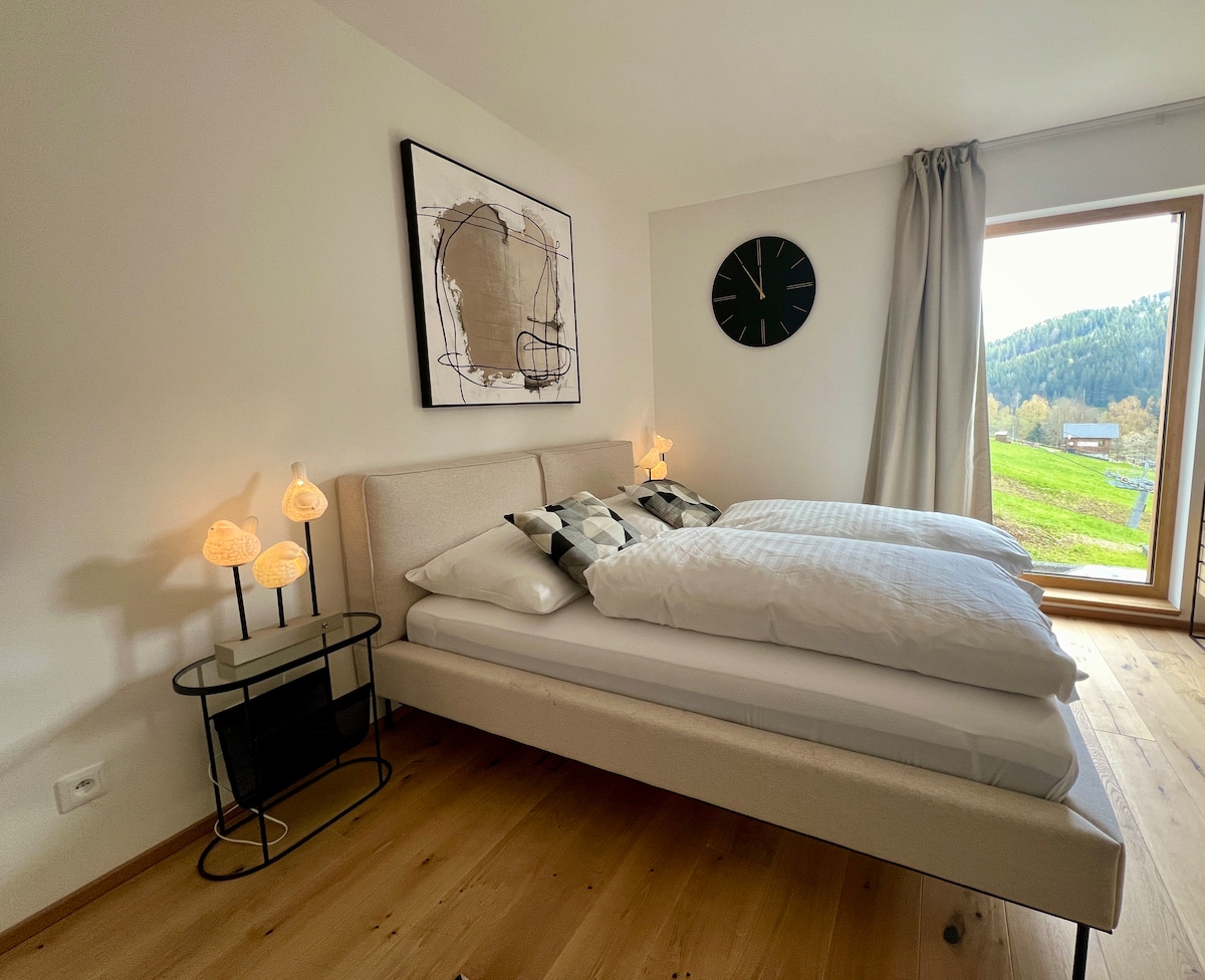 Luxurious, very comfortable and spacious, fully equipped 3-room apartment. It is located on the first above-ground floor of the Ski&Bike barrier-free building and its area is 110m2. There are two bedrooms. There is also a bathroom, a toilet and a living room with a kitchen. The apartment also includes a heated ski box. The kitchen is fully equipped, furnished with Miele appliances and for coffee lovers we offer a Nespresso coffee machine. WiFi, Sonos sound system and smart TV incl. Netflix.