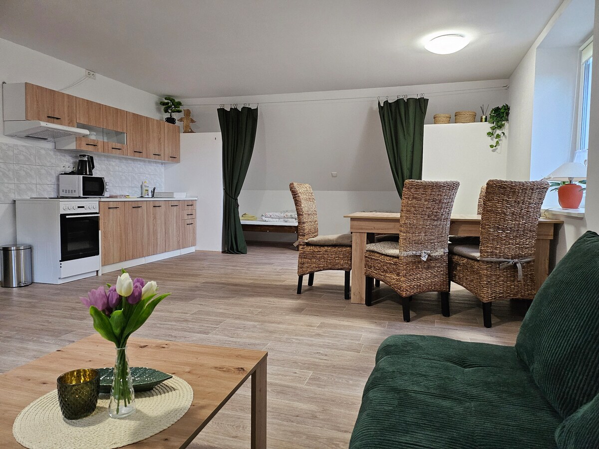Útulný apartmán v Podkrkonoší, mezi lesy s krásnou přírodou okolo. Blízko do hor,do Českého ráje a okolních zákoutí, které stojí za to. V Apartmanu je 1ložnice kde je manželská postel v obýváku patrová postel a možnost rozložení pohodlného gauče pro 2 os. Plně vybavená kuchyň. Koupelna se sprchovým koutem. POPLATEK OBCI SE PLATÍ NA MÍSTĚ V ČÁSTCE 15 Kč/OSOBA !