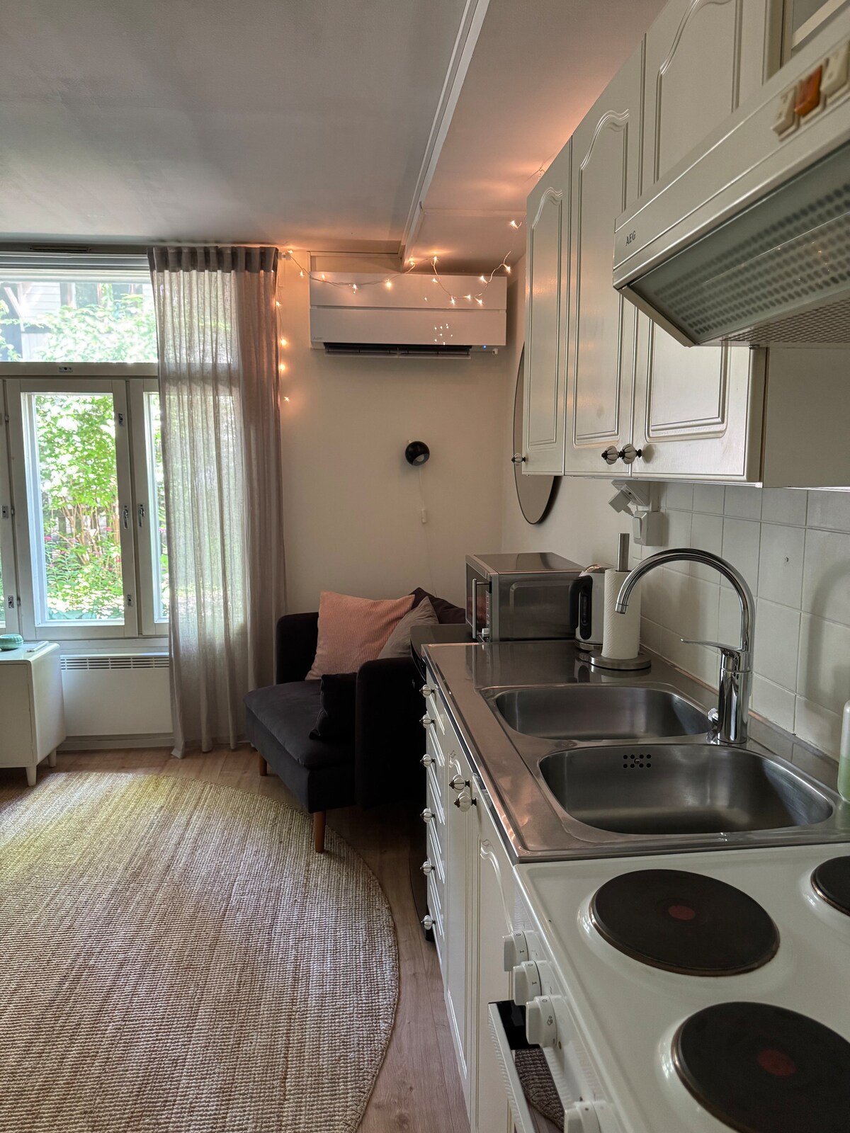Meraviglioso monolocale luminoso al 6° piano proprio nel centro di Turku, vicino a tutti i servizi. L'ampio balcone è perfetto per bere il caffè del mattino e godersi la vita di Turku. L'appartamento dispone di un comodo letto e di tutto il necessario per cucinare e divertirsi. In 5 minuti a piedi si arriva al mercato, alla riva del fiume e alla stazione ferroviaria. Fermata dell'autobus proprio davanti alla porta.