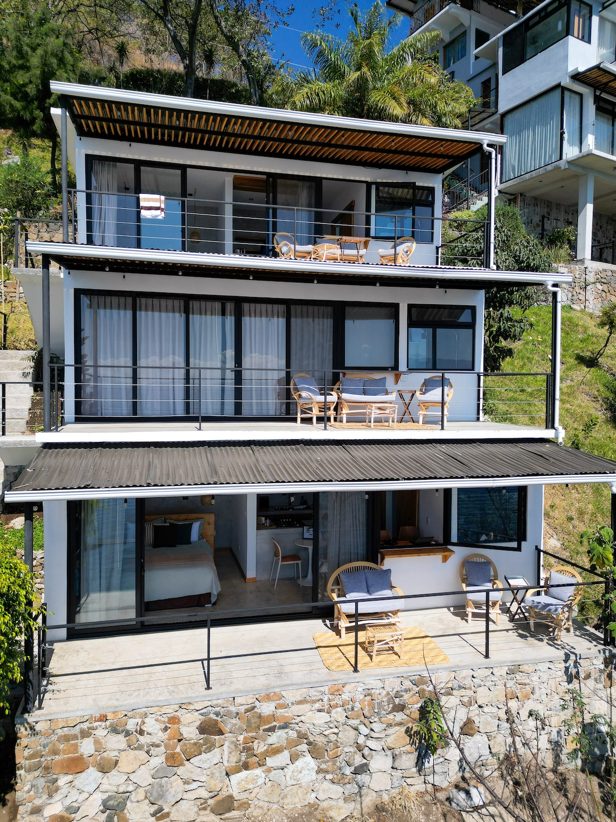 Casa Amate is a unique glass-fronted home built into the mountain-side overlooking one of the world's most beautiful freshwater lakes. With three bedrooms and three bathrooms, sleeping six, this is the perfect place to relax, unwind and take in the spectacular views of the lake and its three volcanoes. Built into the rock face, but still on right on the lake front, the house cascades down four levels, with numerous terraces. The space is defined by the rock face, glass, concrete, wood & light.