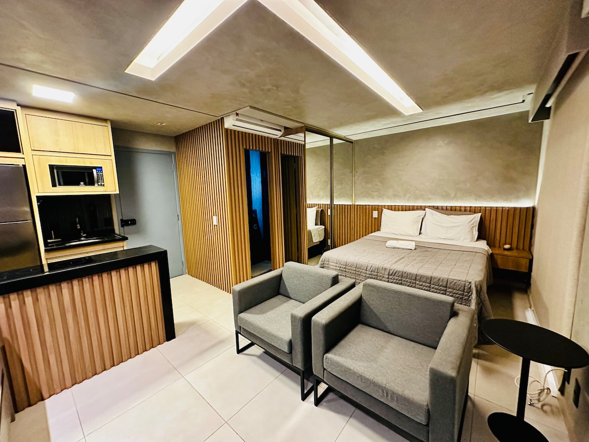 Questo posto è pieno di stile! Moderno e molto accogliente, ha una vista mozzafiato sul rooftop più famoso di Rio Preto! Un loft integrato di 33m. Soggiorno con Smart Tv, Internet 250M, cucina, bagno con doccia eccellente, accogliente letto matrimoniale e biancheria da letto e bagno completa. Situato nell'edificio più alla moda di S.J do Rio Preto, il Duo JK! Si trova a pochi minuti dall'ospedale di base, Famerp e Unip. Facile accesso ad autostrade, centri commerciali e supermercati. Posto auto gratuito!