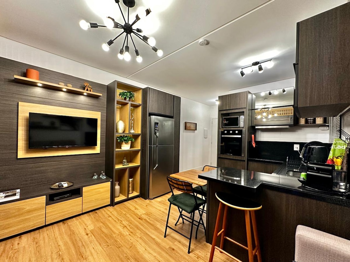 Estúdio completo, conforto e luxo. Localizado na torre residencial, muito silencioso! Possui uma cama de casal e mais um sofá-cama. Novo e mobiliado, equipado com TUDO que uma casa precisa ter com conforto e praticidade. Roupa de cama 100% algodão egípcio de 400 e 700 fios. Televisão 70 polegadas com internet e Netflix. Toalhas super confortáveis e esterilizadas! Cafeteira com cafés gourmet de cortesia para os hóspedes. Ar condicionado quente e frio. Garagem. Carregador de carro elétrico.