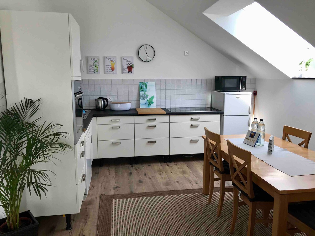 Il luminoso appartamento con 1 camera da letto è arredato in stile industriale/retrò. Vi aspettano una cucina completamente attrezzata e un fresco drink di benvenuto. Letto matrimoniale da 1,80 m, che può essere trasformato in 2 letti singoli su richiesta. Una grande TV a schermo piatto e un accogliente angolo da pranzo. Un nuovo bagno con doccia a pioggia e servizi igienici Zanzariere e tapparelle Il parcheggio gratuito è disponibile in strada, o a pochi minuti a piedi Supermercato REWE, ristorante, collegamento con l'autobus a pochi minuti a piedi