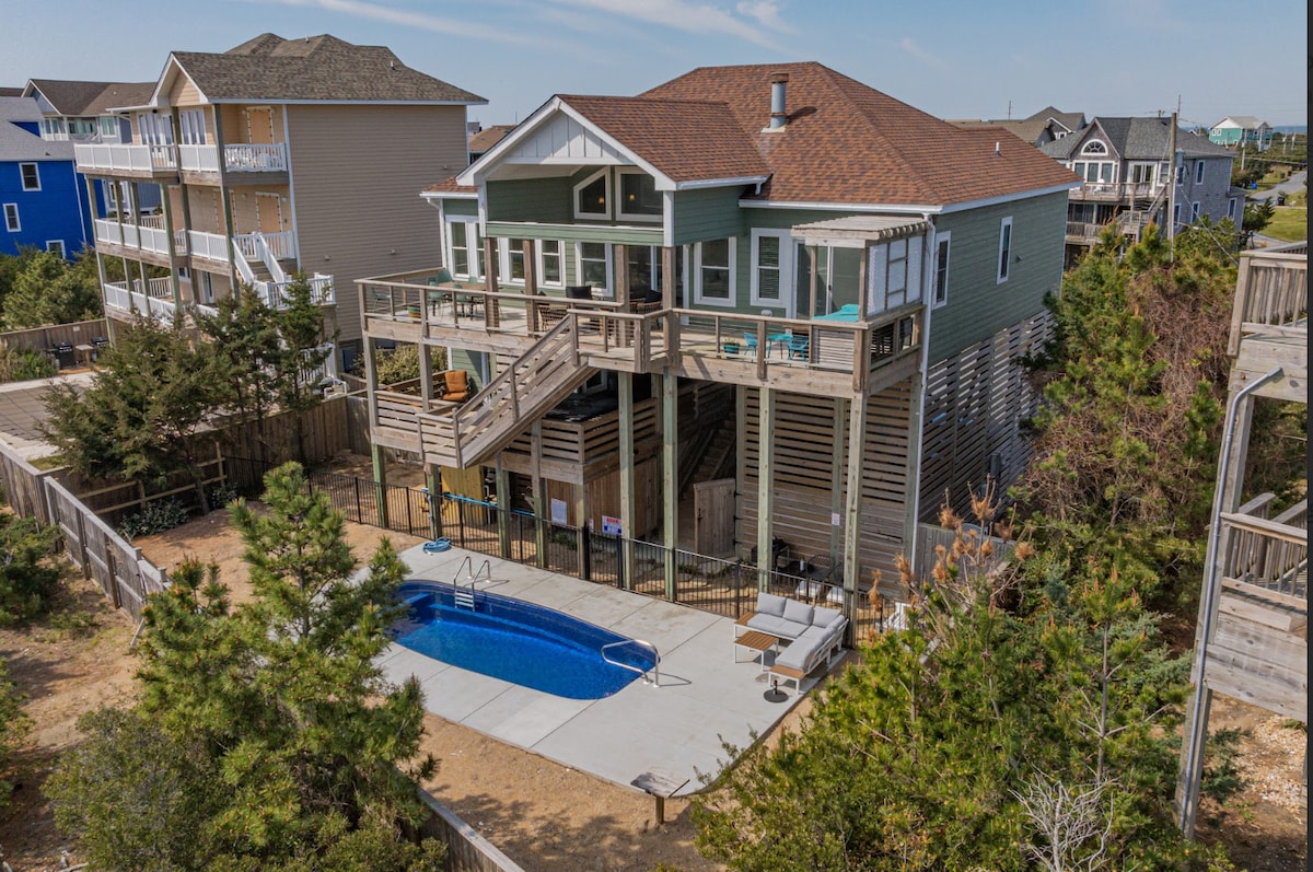 Sconto disponibile per soggiorni prolungati Goditi questa accogliente casa sulla spiaggia, a pochi passi dall'Oceano Atlantico e dal Pamlico Sound. Perfetta per gli amanti della spiaggia, del kiteboarding e degli sport acquatici, o per chi vuole trascorrere una vacanza con la famiglia e gli amici. All'interno troverai due salotti, uno con tavolo da biliardo e bar. TV a grande schermo con canali via cavo premium e audio surround in ogni stanza. Goditi l'osservazione delle stelle mentre ti rilassi nella vasca idromassaggio sul ponte. Situata nei Tri-Villages, vicino a ristoranti e negozi.