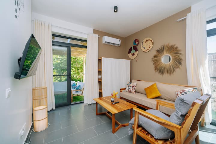 Welcome to our cozy Airbnb in Michamvi, where comfort meets island charm. Relax on the spacious wooden patio set, perfect for morning coffee or evening chats. Inside, enjoy a beautifully made bed with vibrant local fabrics and thoughtful towel art, prepared by our caring housekeeping team. The serene setting, bright spaces, and attention to detail make this a peaceful retreat just minutes from the beach. Forget your worries in this spacious and serene space.