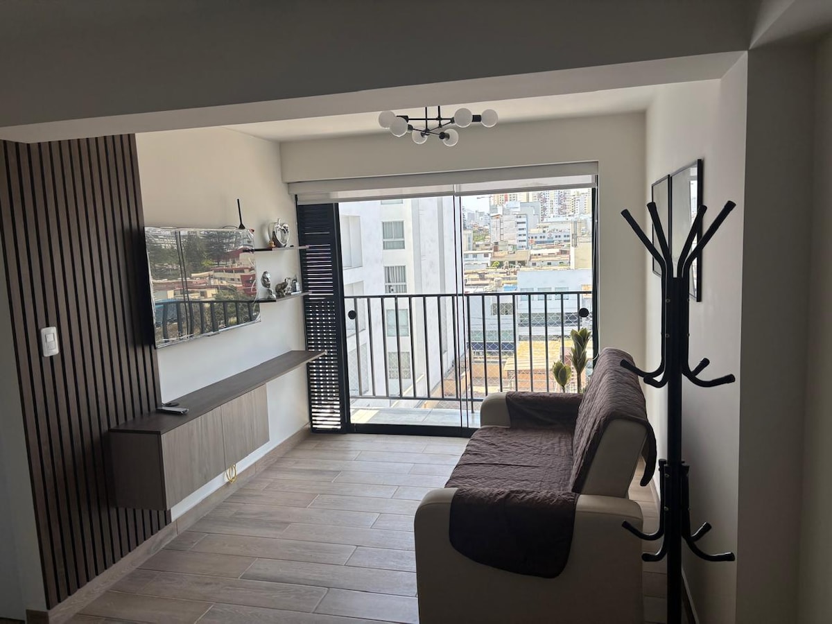 Departamento de estreno completo totalmente equipado que esta ubicado en una zona estratégica de avenida principal en Lima, Perú. Con áreas comunes en el edificio para que hagan de tu estancia una experiencia única. Está creado con la intención de ofrecer un espacio cálido y acogedor a mis huéspedes, además de unas vistas panorámicas excepcionales que te permitirán disfrutar de las puestas de sol y de la belleza de la ciudad.