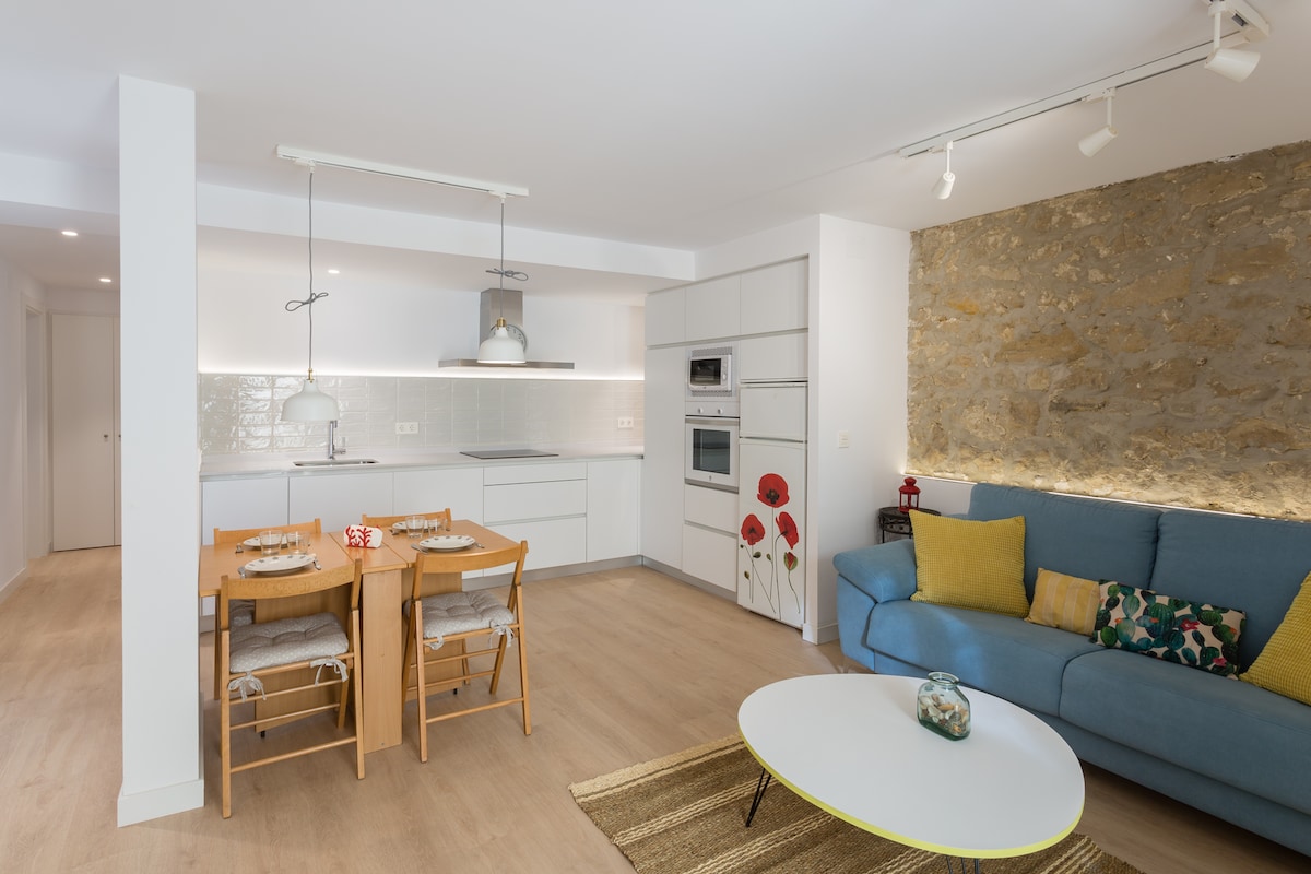 De estilo urbano y acogedor, este nuevo apartamento de un dormitorio con cama kingsize y sofá cama (144x180cm)se encuentra en el corazón del barrio de Gros, a 1 minuto a pie del centro de la ciudad Impecablemente recién reformado cuenta con aire acondicionado, televisión 55", Wifi, Nesspreso. Completamente equipado para niños y bebés. Perfectamente ubicado a 2 minutos de la estación de autobuses y de trenes, así como al lado de una parada directa de autobús para el aeropuerto de San Sebastián.