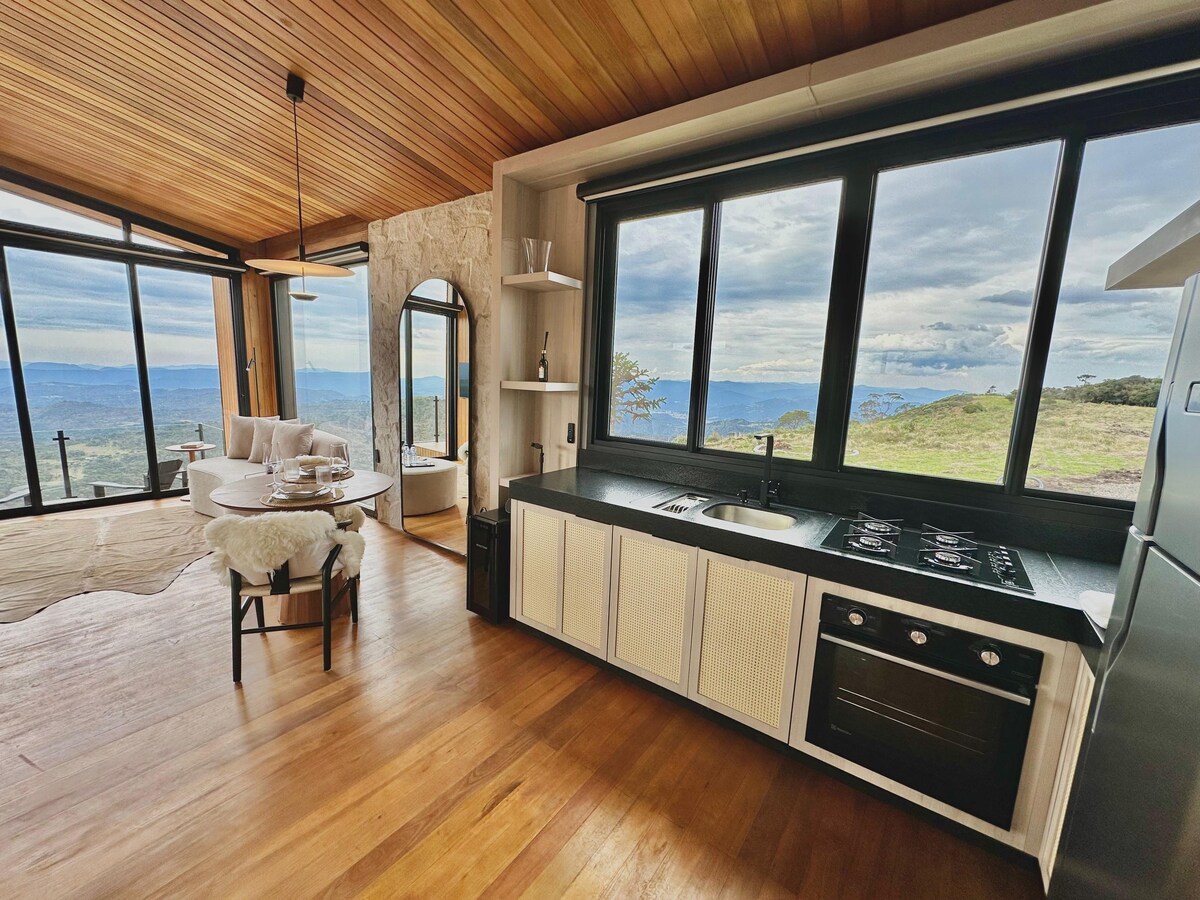 Uno chalet architettonico unico, situato in uno dei siti più incredibili di Urubici a 1250 m di altitudine, con una vista aperta sulla splendida valle da cui si può ammirare un meraviglioso tramonto! All'interno della casa sono presenti tutti i comfort per ospitare fino a 4 persone: 2 camere da letto, bagno, cucina, soggiorno con TV e stufa, internet Starlink e altri servizi. Urubici offre splendidi paesaggi e molte sistemazioni, ma un design unico e una splendida vista sono i punti che rendono esclusiva questa casa. @VillaAlva