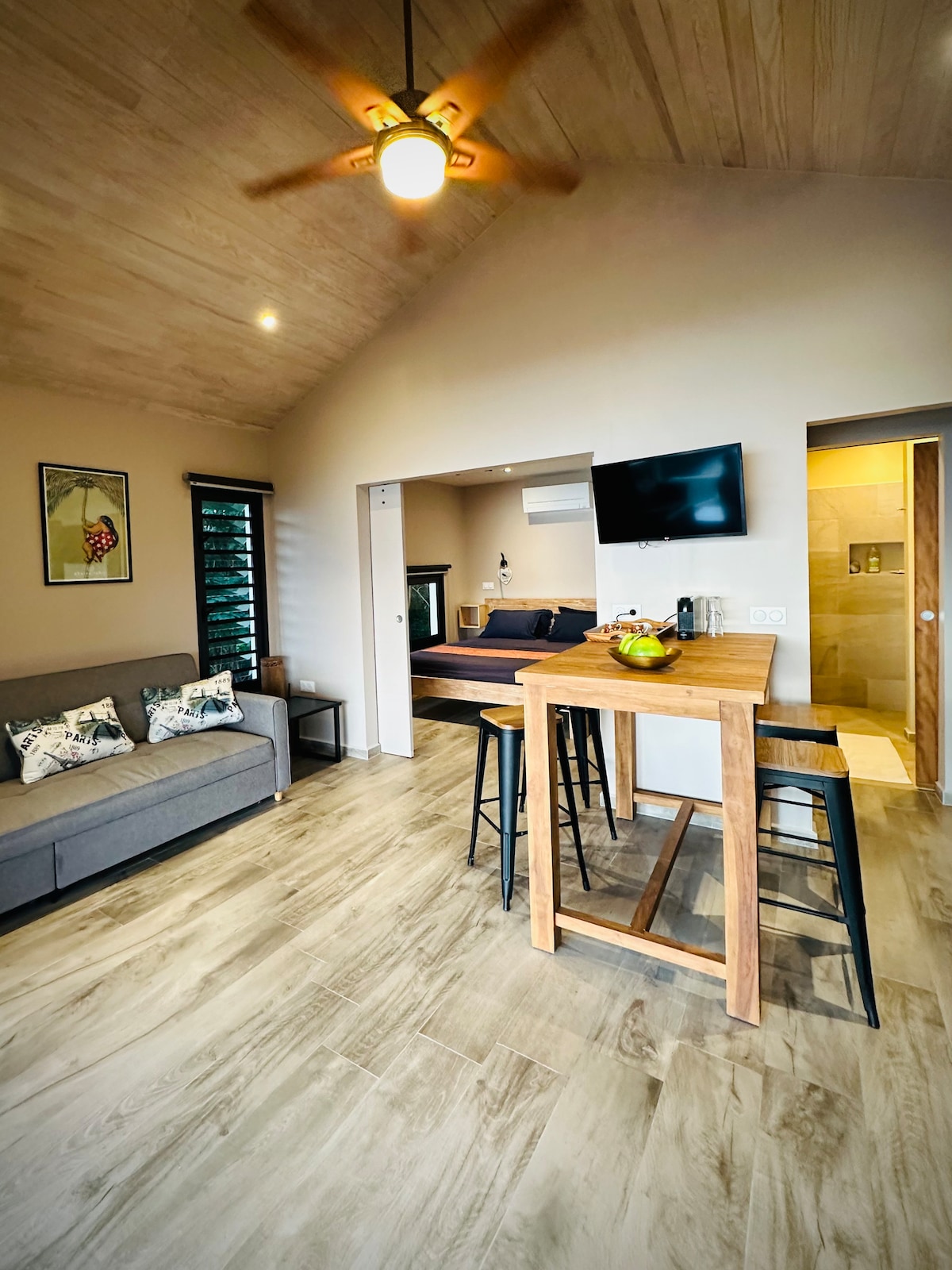 Joli bungalow 50 m2 , agréable et confortable, entièrement à disposition des voyageurs comportant : une chambre spacieuse avec grand lit neuf, chambre climatisée, cuisine toute équipée, salle de bain, terrasse couverte, deck et pergola. La chambre est équipée de moustiquaires et des anti moustiques sont fournis. Idéal pour un couple. Situé dans un quartier calme à seulement 2,5km du centre ville.