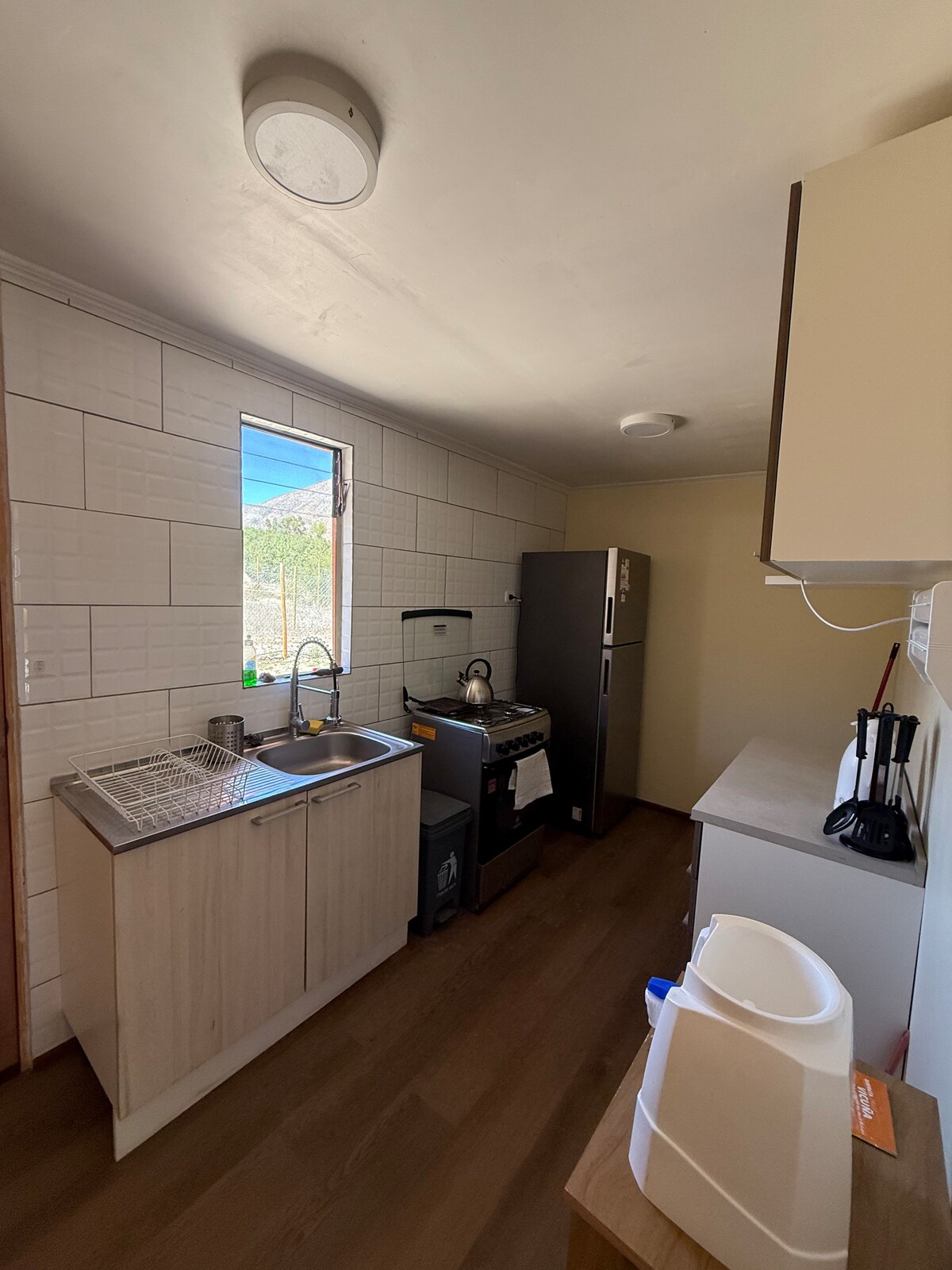 Cottage privato rustico-moderno situato a 2 isolati da Plaza de Pisco Elqui, vicino a ristoranti e negozi. Parcheggio privato. 1 camera da letto con bagno privato, 1 letto a 2 posti (lenzuola, coperte, copriletto, cuscini e cuscini). 1 comodino, 1 lampada, 2 comodini, divano, mobile antico restaurato e 1 altoparlante Bluetooth. 1 stufa elettrica per l'inverno. Cucina, lavastoviglie e minibar in terrazza (pentole, stoviglie, posate, teiera, ecc.) e griglia a carbone. Intorno c'è molta vegetazione.