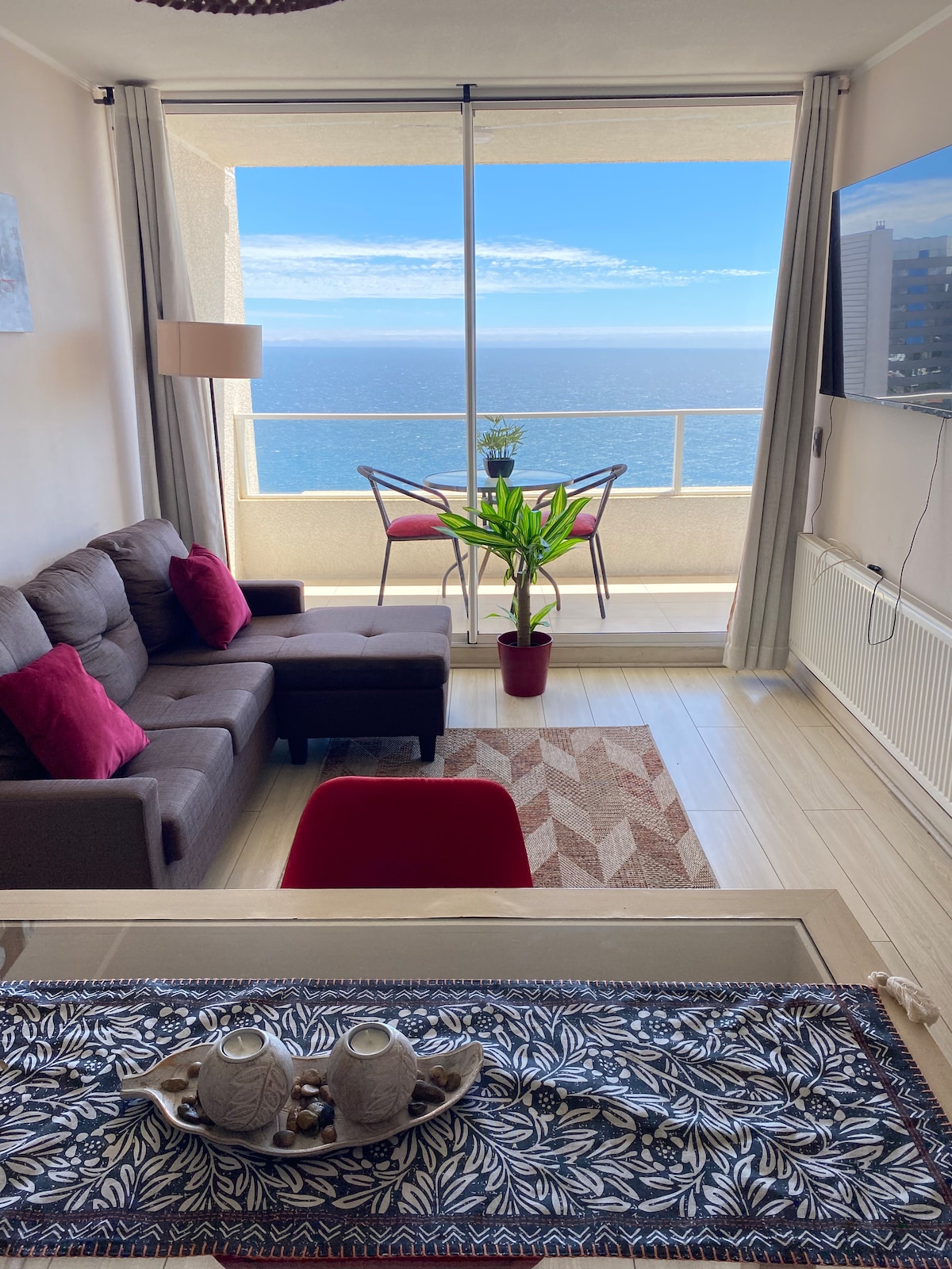 Lindo departamento tipo estudio con vista al mar, full equipado para dos personas. Condominio cuenta con 1 piscina habilitada en el piso 7, conserjería las 24 horas, cafetería y estacionamiento techado privado. Acceso a playa Cochoa a traves de funicular del edificio (piso 1) o por escaleras (a 300 m). Departamento cuenta con WIFI, smart TV, secador de pelo, toallas, sábanas, calefactor, closet. Buena conectividad y cercano a restaurantes, cafés, supermercados, dunas de Concón y playa de Reñaca